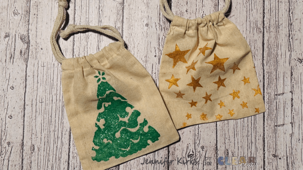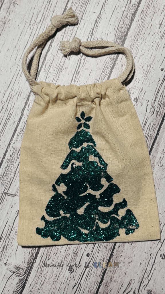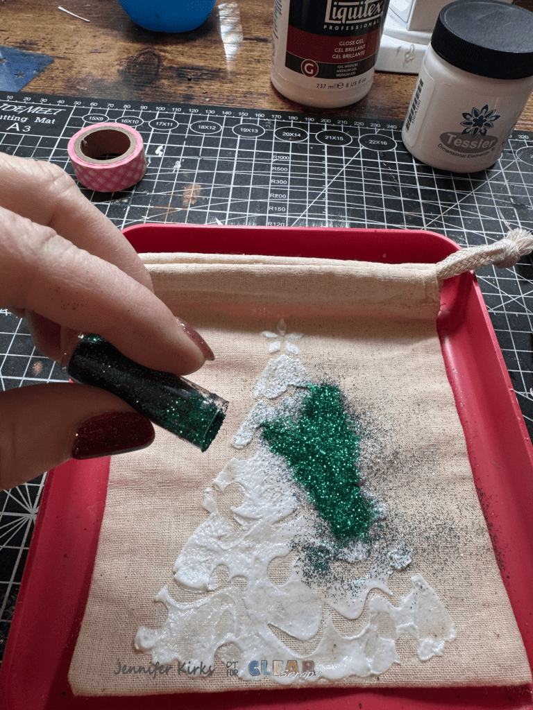 On another bag, I went bolder — applying the gel and topping it off with deep green glitter for a rich, festive look.