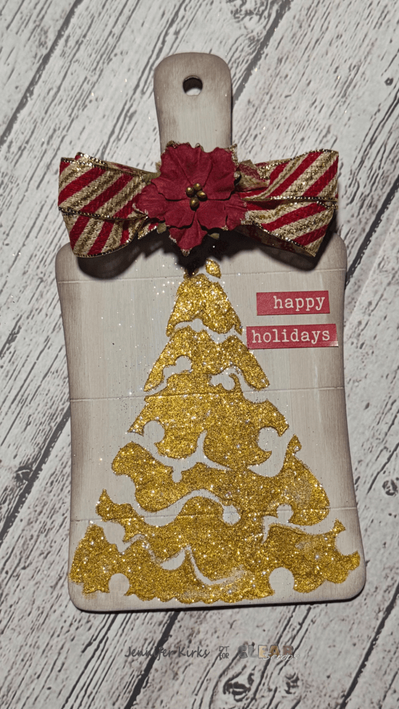 Before the gel mixture dried, I sprinkled on a touch of glitter for that extra sparkle. ✨ Once everything set, I added the finishing touches — a red and gold bow and a cheerful poinsettia — and just like that, my little holiday cutting board was complete!