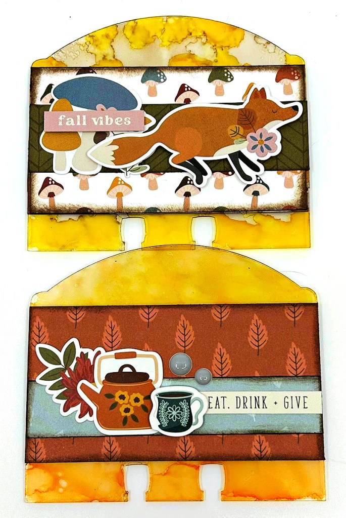 So simple to create too–the acrylic cards were made with the Clear Scraps Rounded Acrylic Dividers. A mixture of orange, yellow and brown alcohol inks were dabbed onto the cards using a felt square. A reminder–remove the protective coating off of both sides of the acrylic! It keeps it nice and protected until you are ready to use!