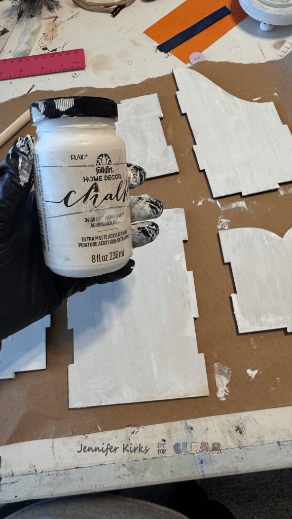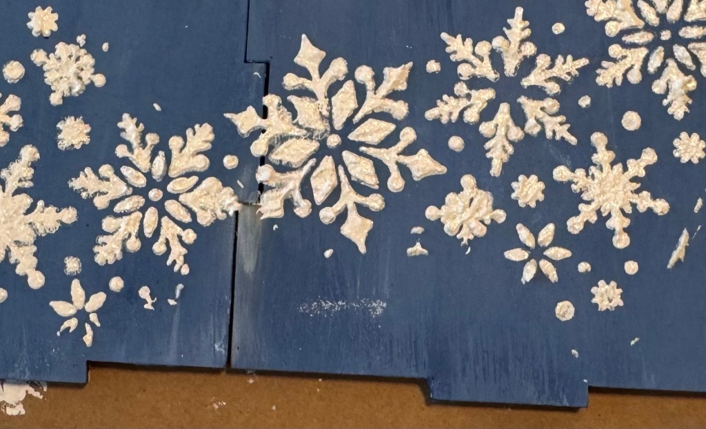 Next came a little texture and shimmer! Using a snowflake stencil, I mixed gel medium and white paint to create a thick, creamy paste and carefully spread it over the stencil. Before it dried, I sprinkled white glitter on top for that frosty sparkle we all love. I added some water to a paper towel and gently wiped the surface down to clean up any white lines. Once everything set, I assembled the box using 3-in-1 glue and decorated the outside with festive embellishments.