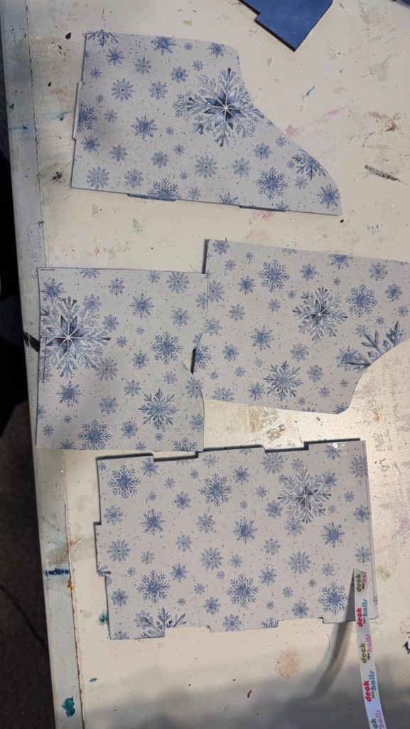 I started by painting the inside of the box white and the outside a cheerful winter blue. Once the paint was dry, I reached for the gorgeous Graphic 45 Christmas collection and chose a snowflake paper to line the inside. I traced, cut, and adhered it neatly, creating a cozy winter backdrop.