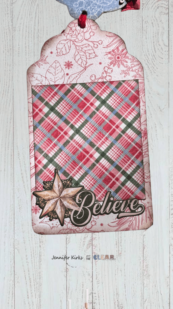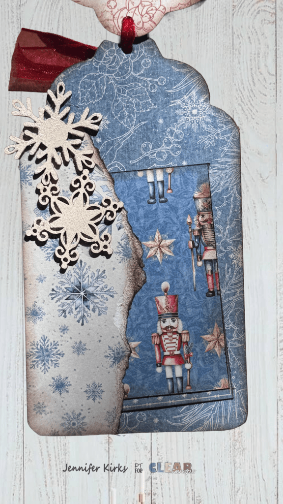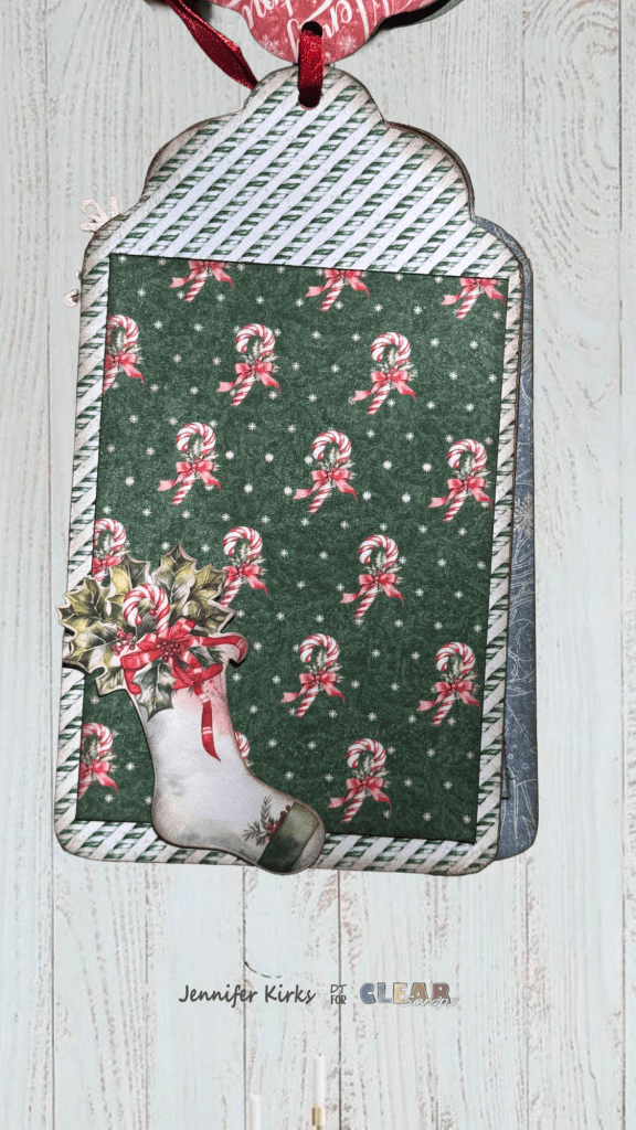 Now, onto the Christmas Tag Album! I traced and cut each base tag, adhering patterned paper to both sides. After trimming the edges with my X-Acto knife, I gently inked the edges with dark brown for a vintage touch. (Tip: Don’t forget to punch the hole before gluing the second side!)