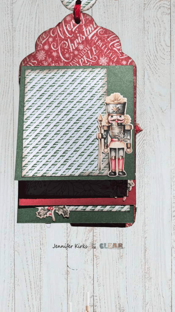 Using the same beautiful Graphic 45 Christmas line, I decorated each page with photo frames, journaling cards, tags, and even a fun waterfall element. A few stickers and glittery accents added extra holiday sparkle. To finish, I tied everything together with a bold red ribbon—the perfect festive touch!