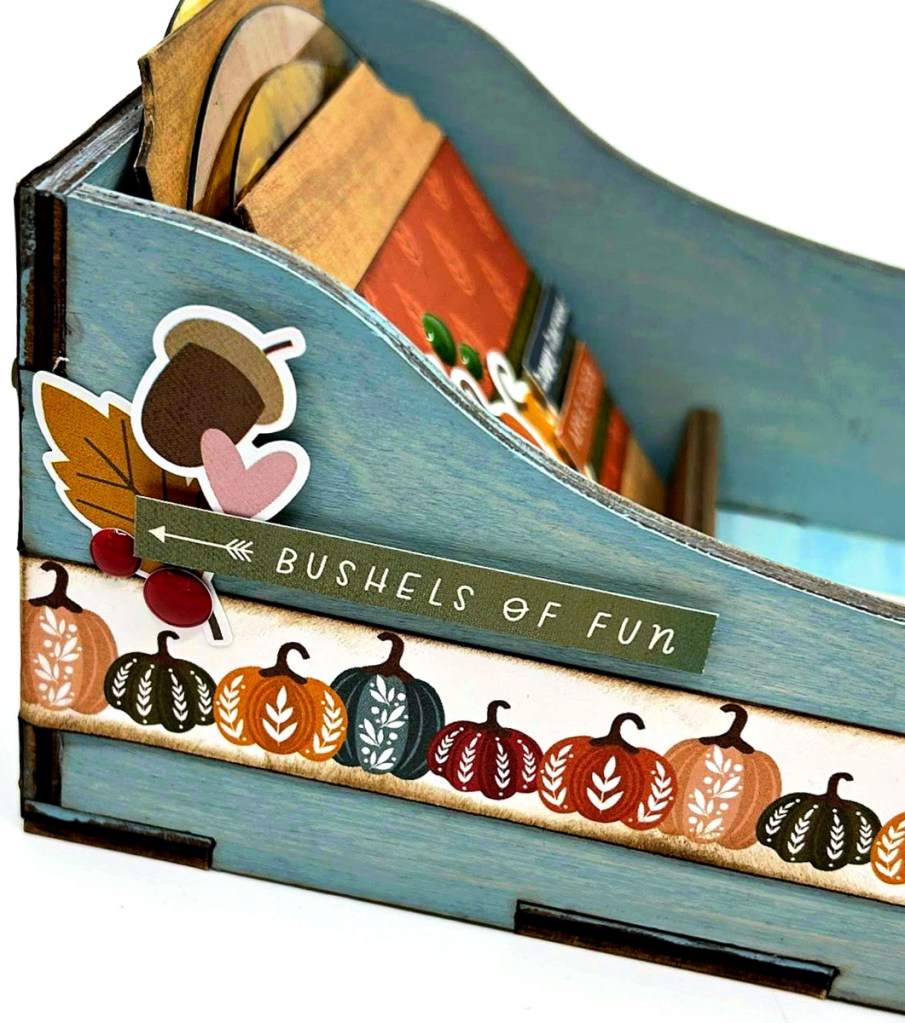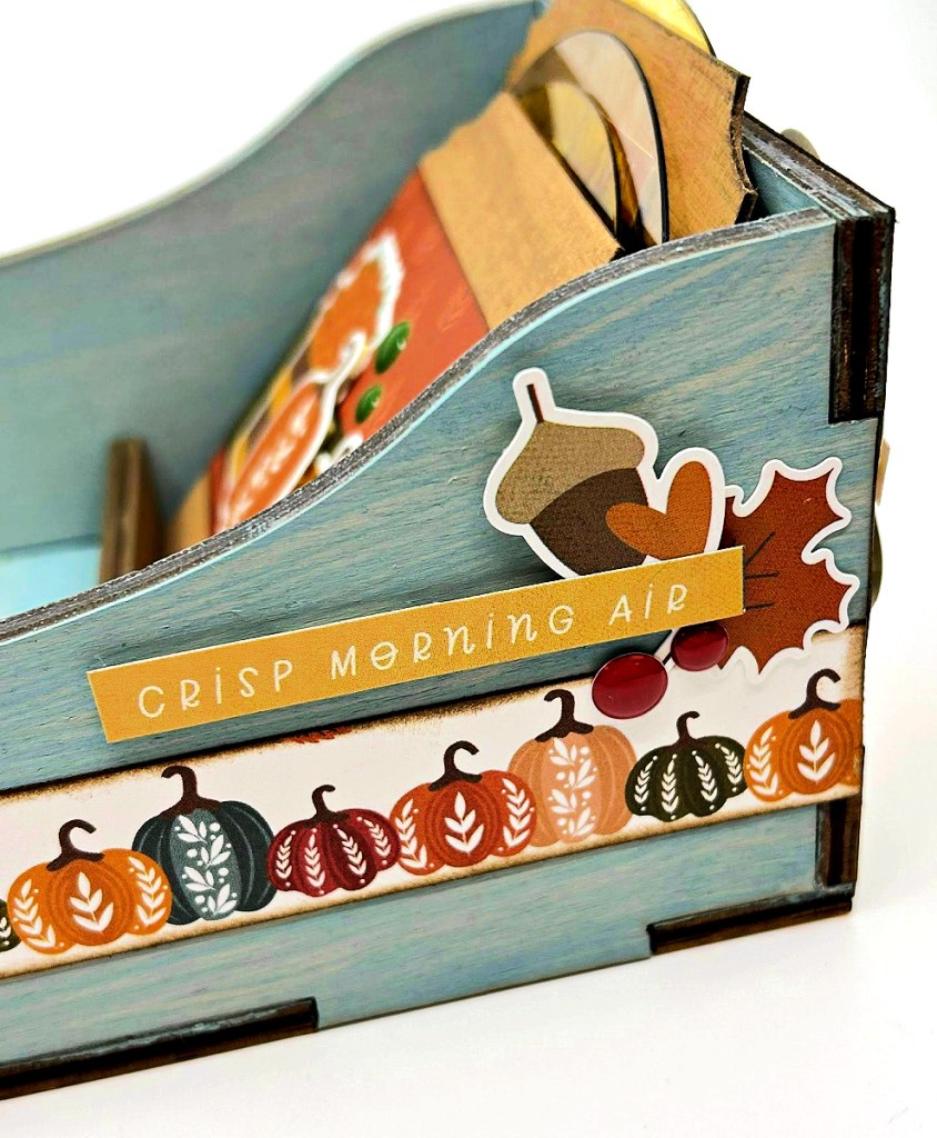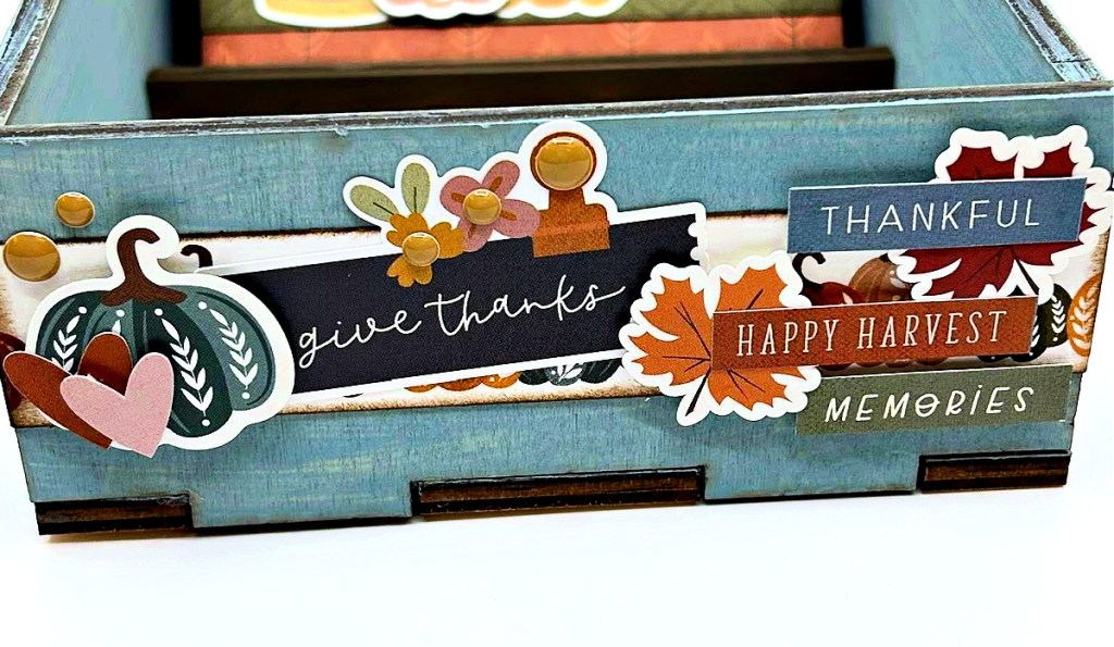 These smaller sentiments and stickers add a lot of interest, without overwhelming the box and the cards inside. It is a perfect way to display photos from thanksgiving/fall that you can display year after year. It’s fun to go through the box and you can also add things like additional photos or journal cards with “thankful” statements as the years go by!