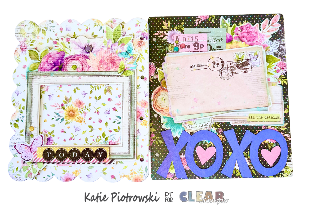 For the final page, I created a large photo mat by layering oversized ephemera pieces, making sure the top and bottom elements peek out no matter what photo size I choose. The title for this page is the XOXO Chipboard Embellishment, painted with acrylic markers to coordinate perfectly. A few brads and enamel dots give the finishing touches to this romantic, layered page.