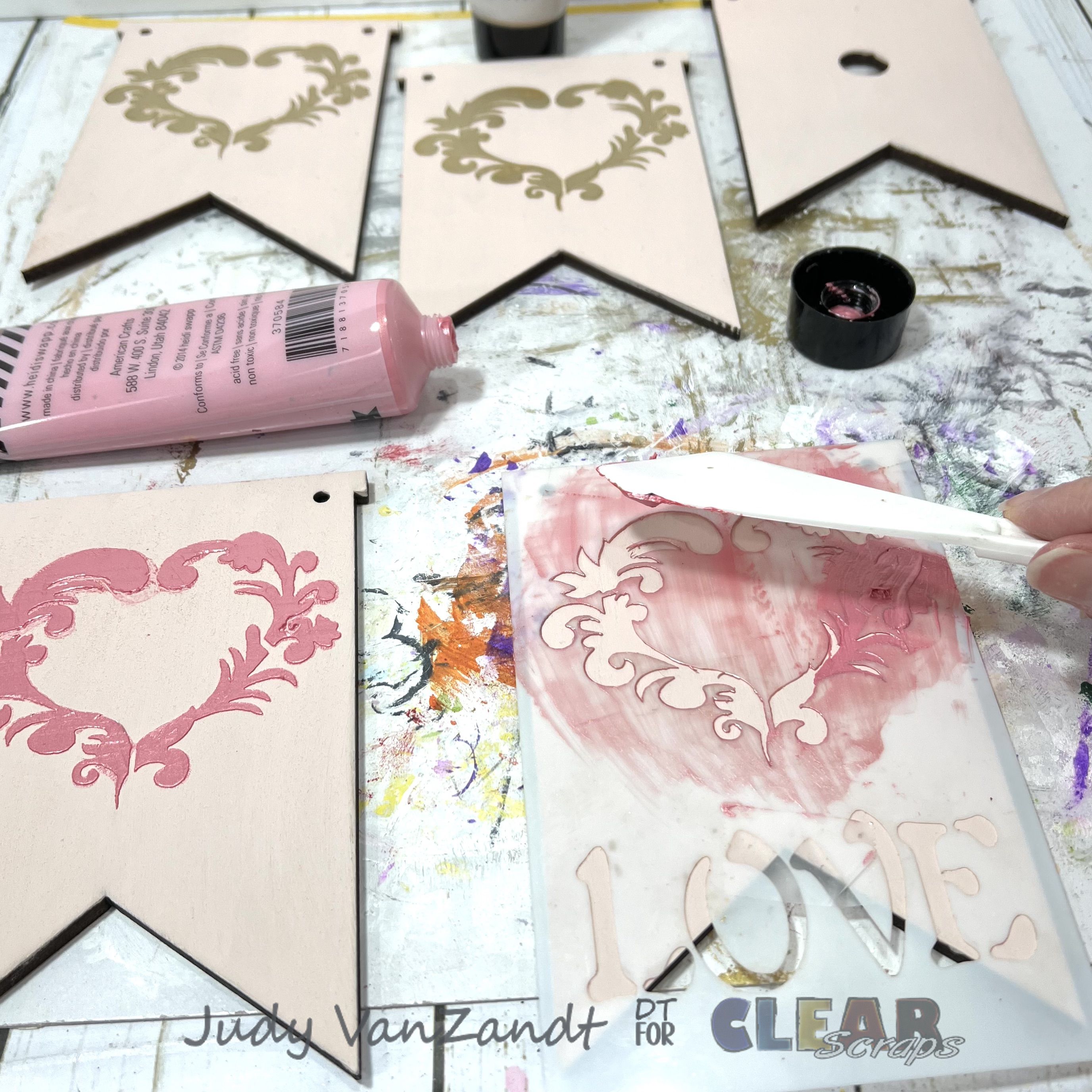 Position your heart or decorative stencil onto 4 of the banner pieces. Using a pallet knife apply even coats of texture paste. Carefully remove the stencil and allow the designs to dry.