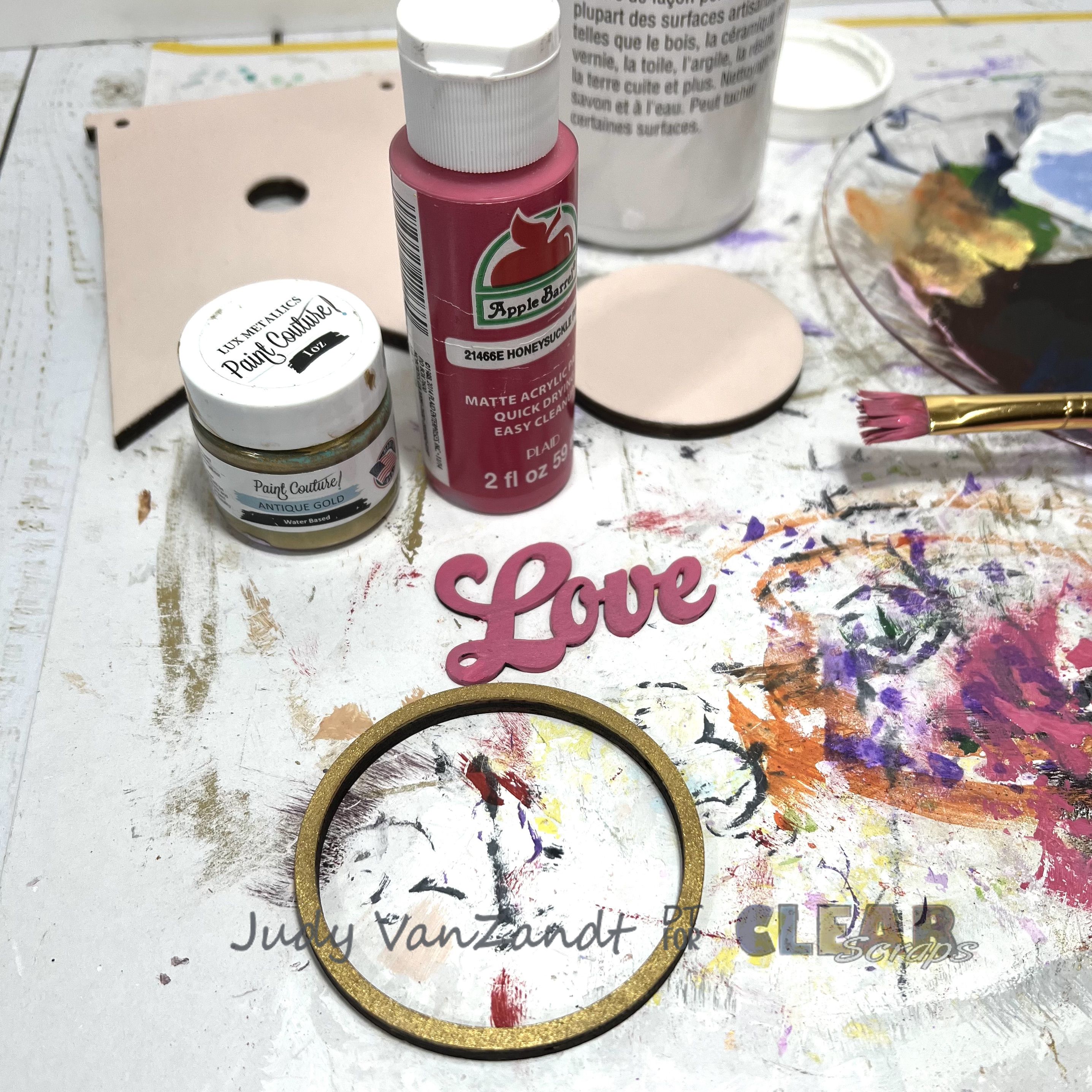 For the center banner, add paint to the wood ring. Paint the Love chipboard piece.