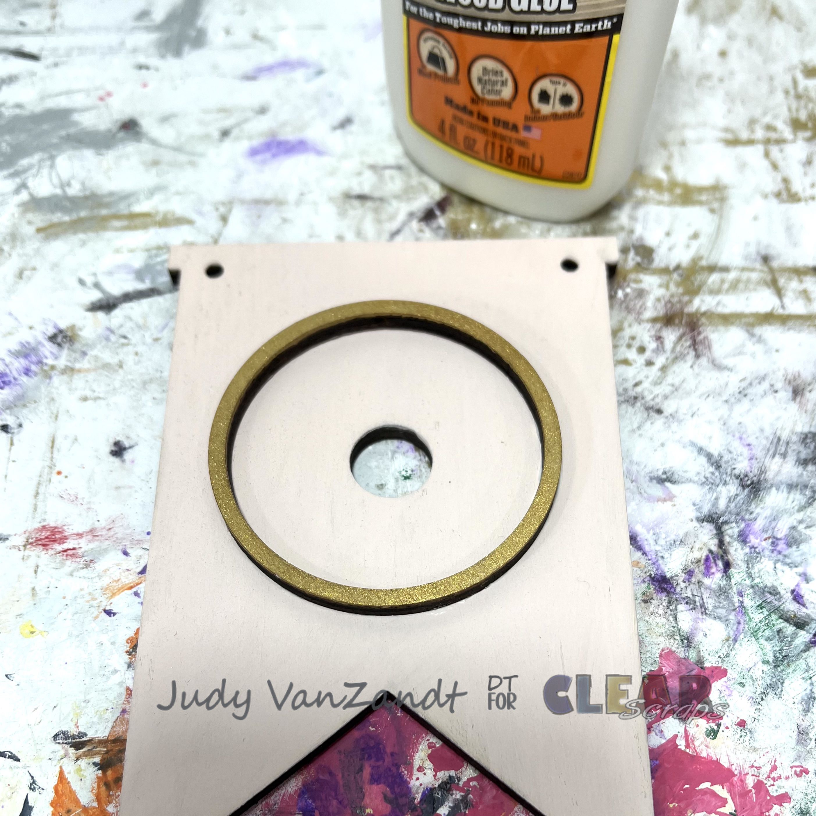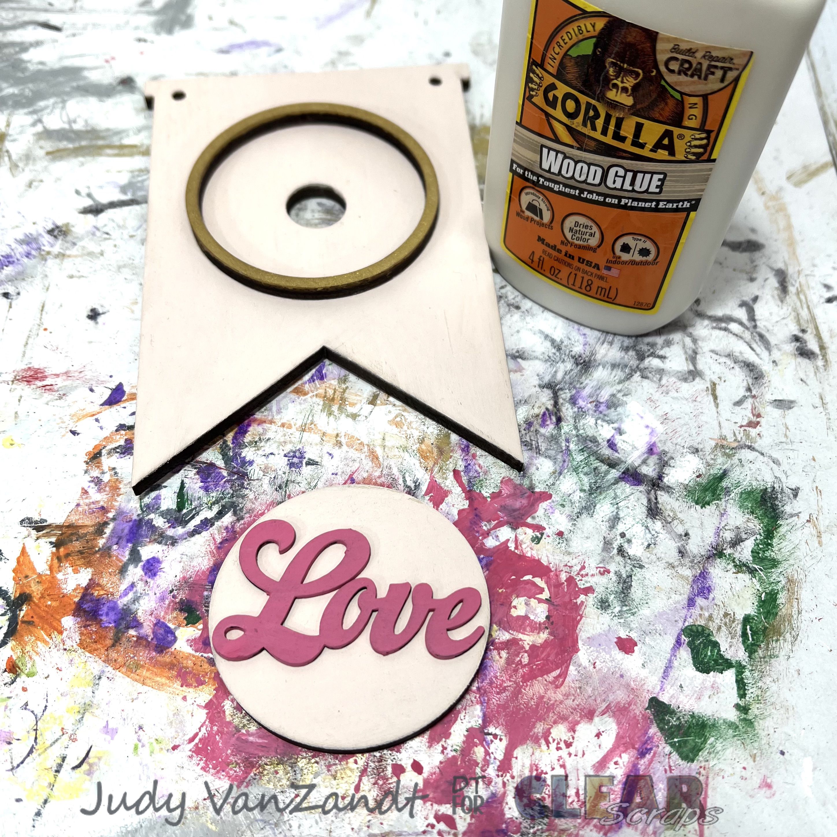 Once dry, adhere the ring to the center banner piece using wood glue. Adhere the chipboard Love to the interchangeable wood circle.