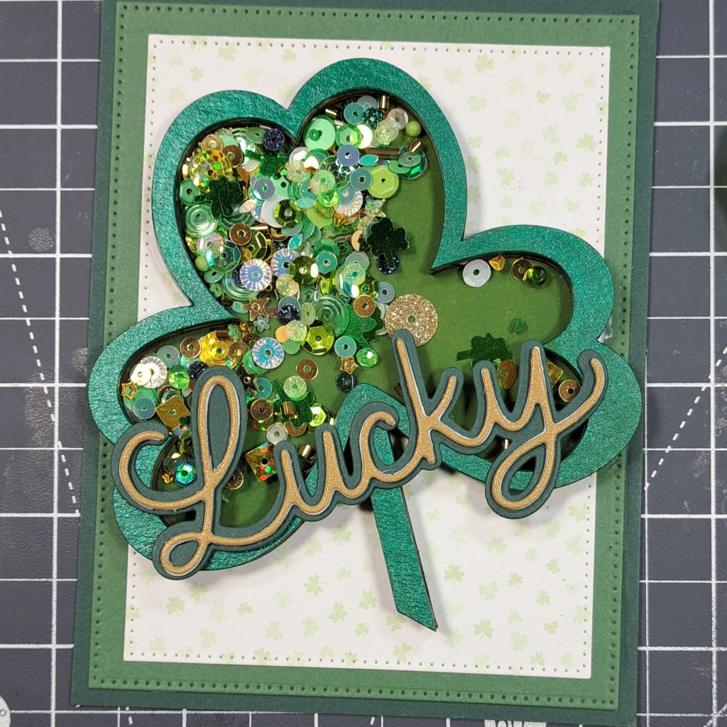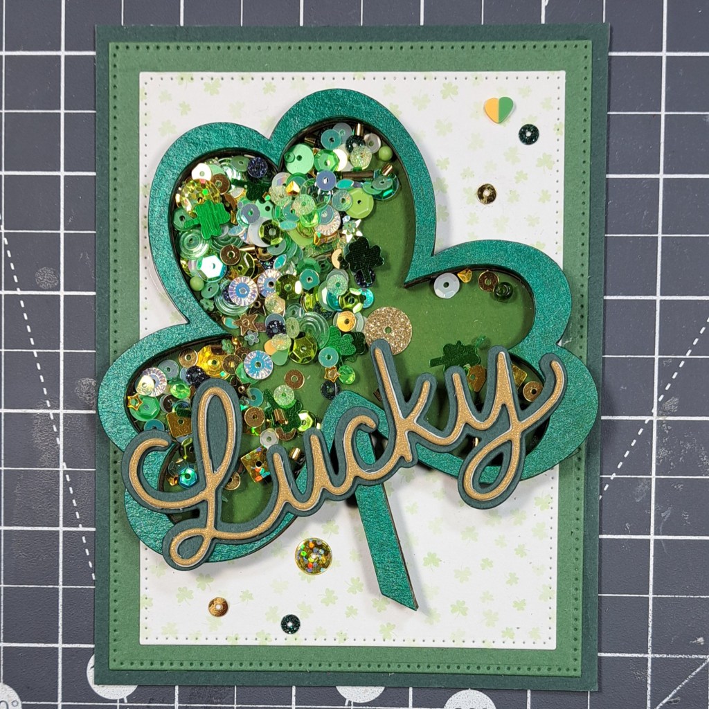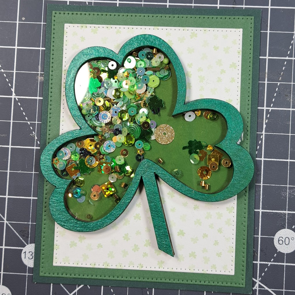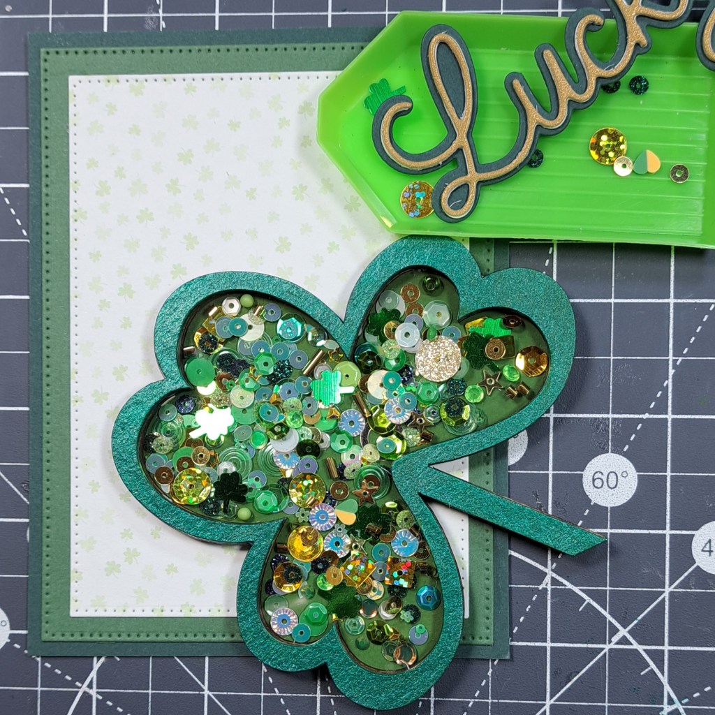 I adhere the Clear Scraps Mini Shaker Shamrock to the card.