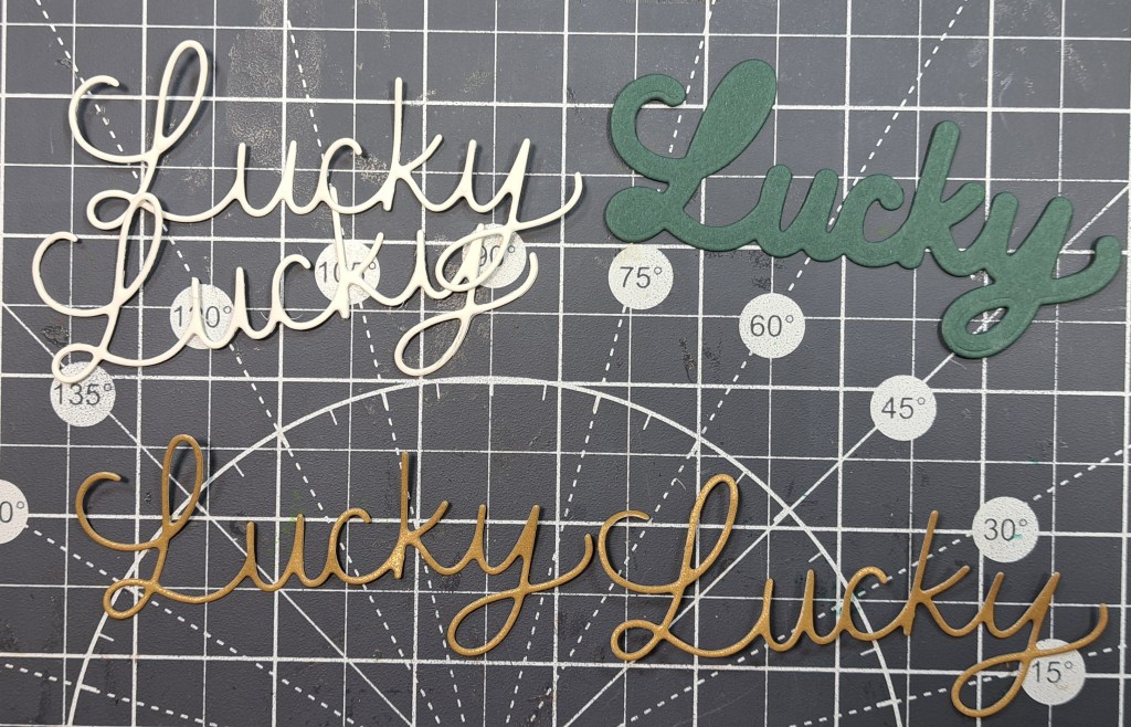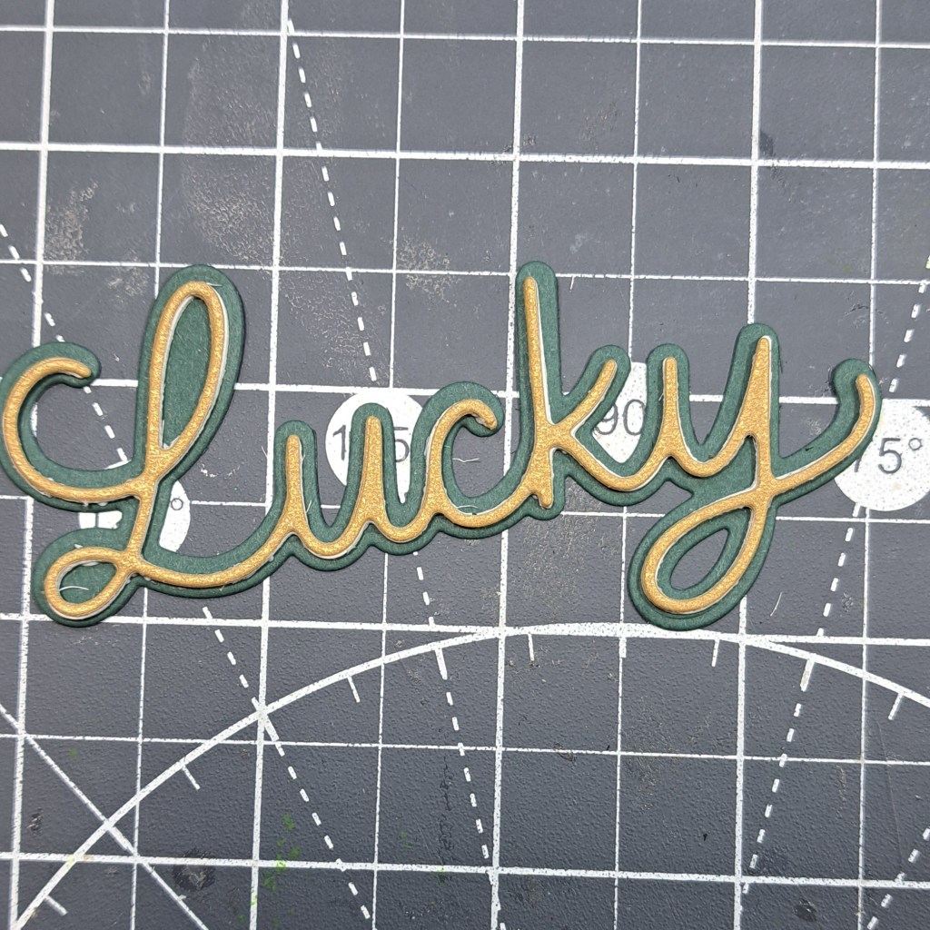 While the pieces of the Clear Scraps Mini Shaker Shamrock dry I adhere the pieces of the die cut sentiment together. I die cut 2 from white cardstock and 2 from shimmer cardstock. I adhere them together to make a thick chipboard piece. Then, I adhere it to the back piece.