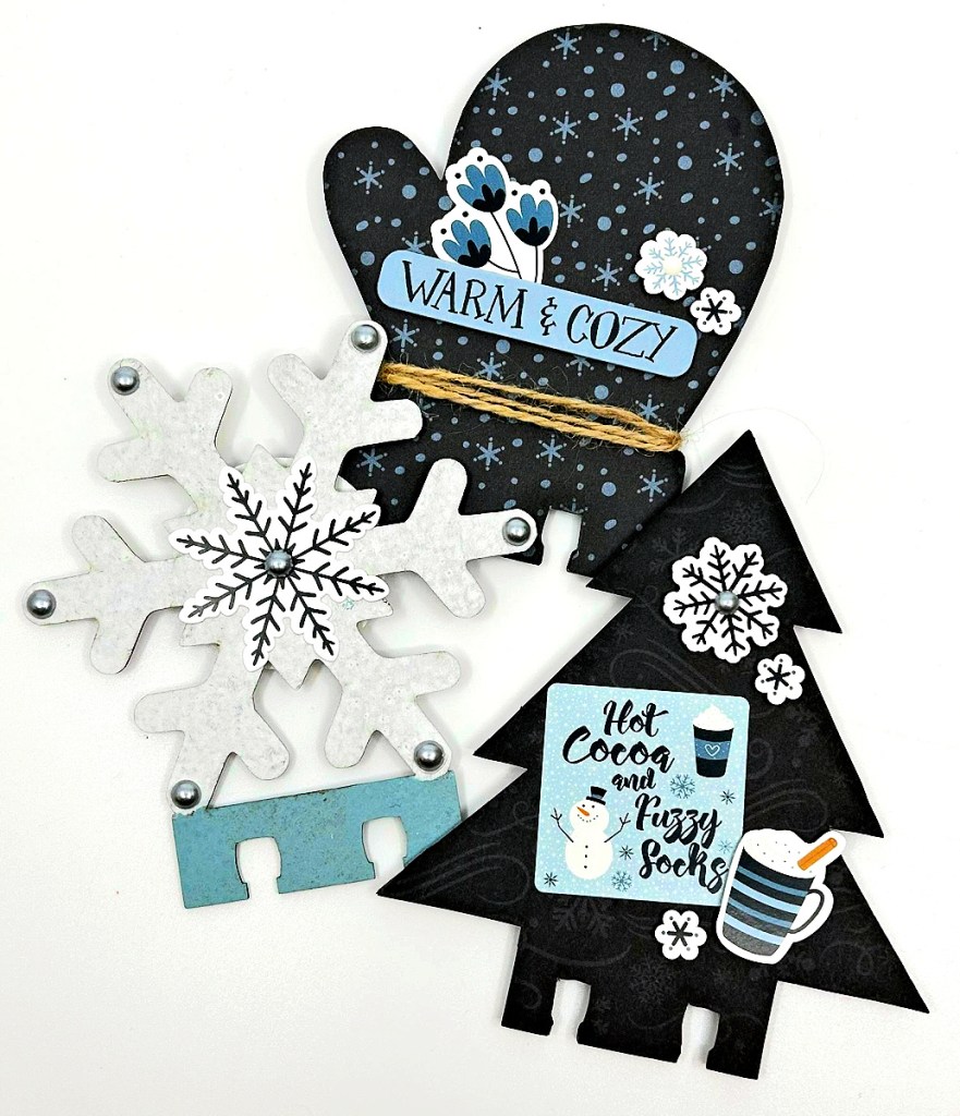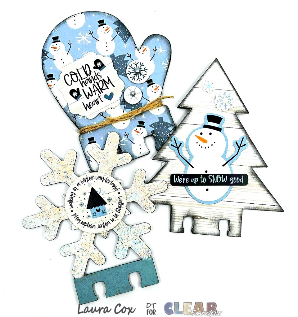 Who is in love with the adorable options in the Clear Scraps Memory-Dex collection??!! These sweet Holiday Memory-Dex Cards are the perfect example! They can be painted, covered with paper, sprays, etc. For this project, I used paint and then once dry, a sparkly glitter glue on the snow flake card. The other two shapes were traced out and then cut out of a pretty patterned paper and then after glued down, they were brushed with ink around the edges.