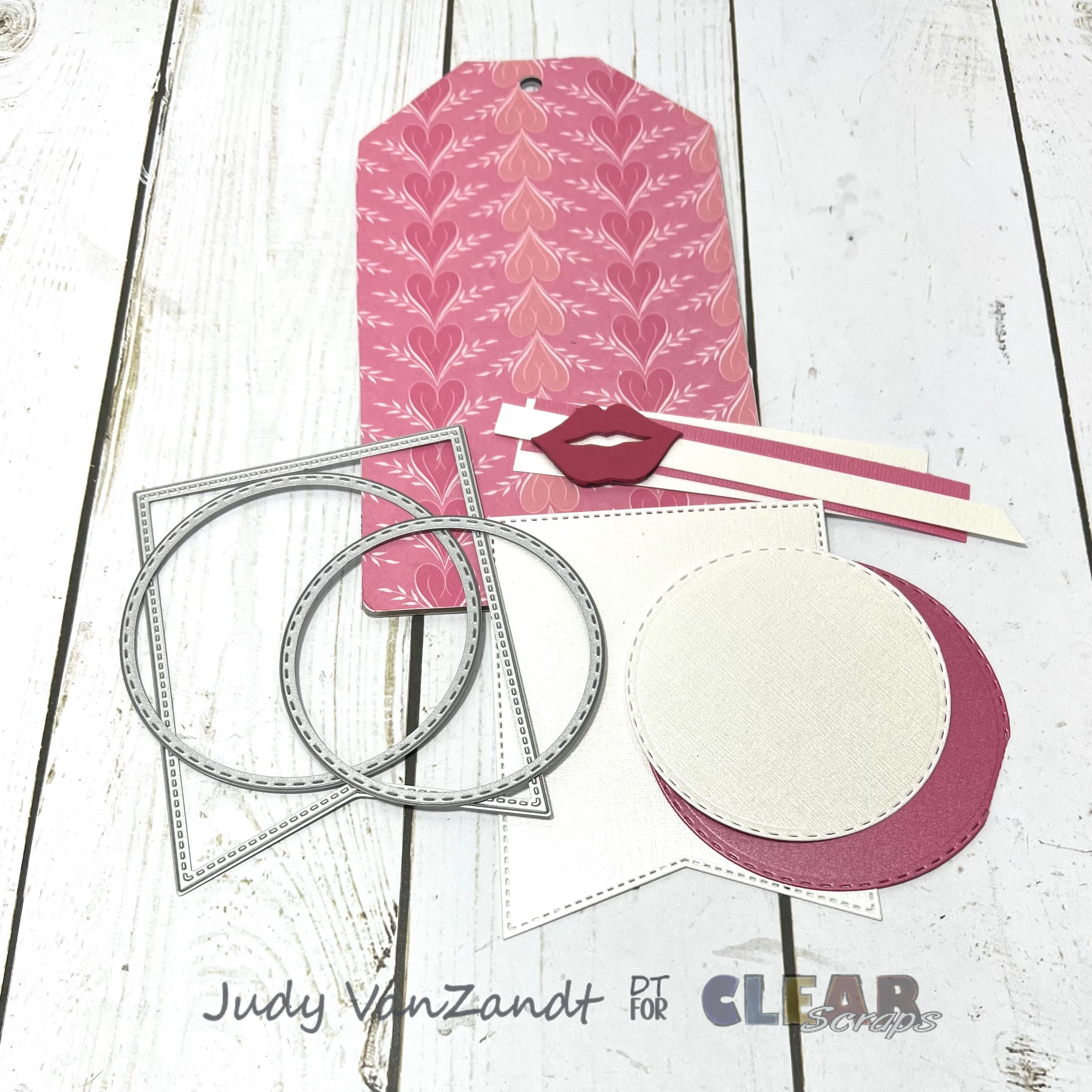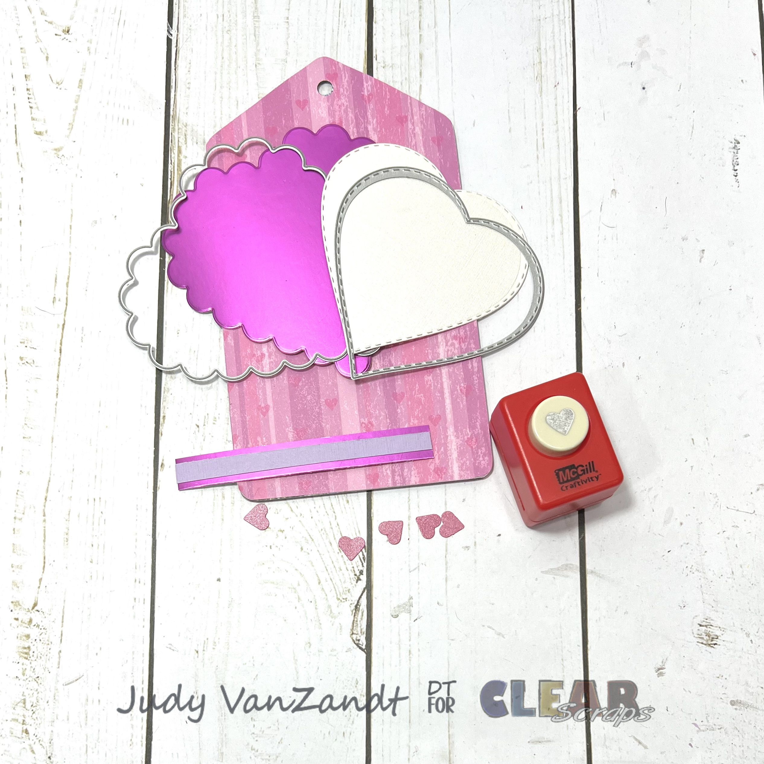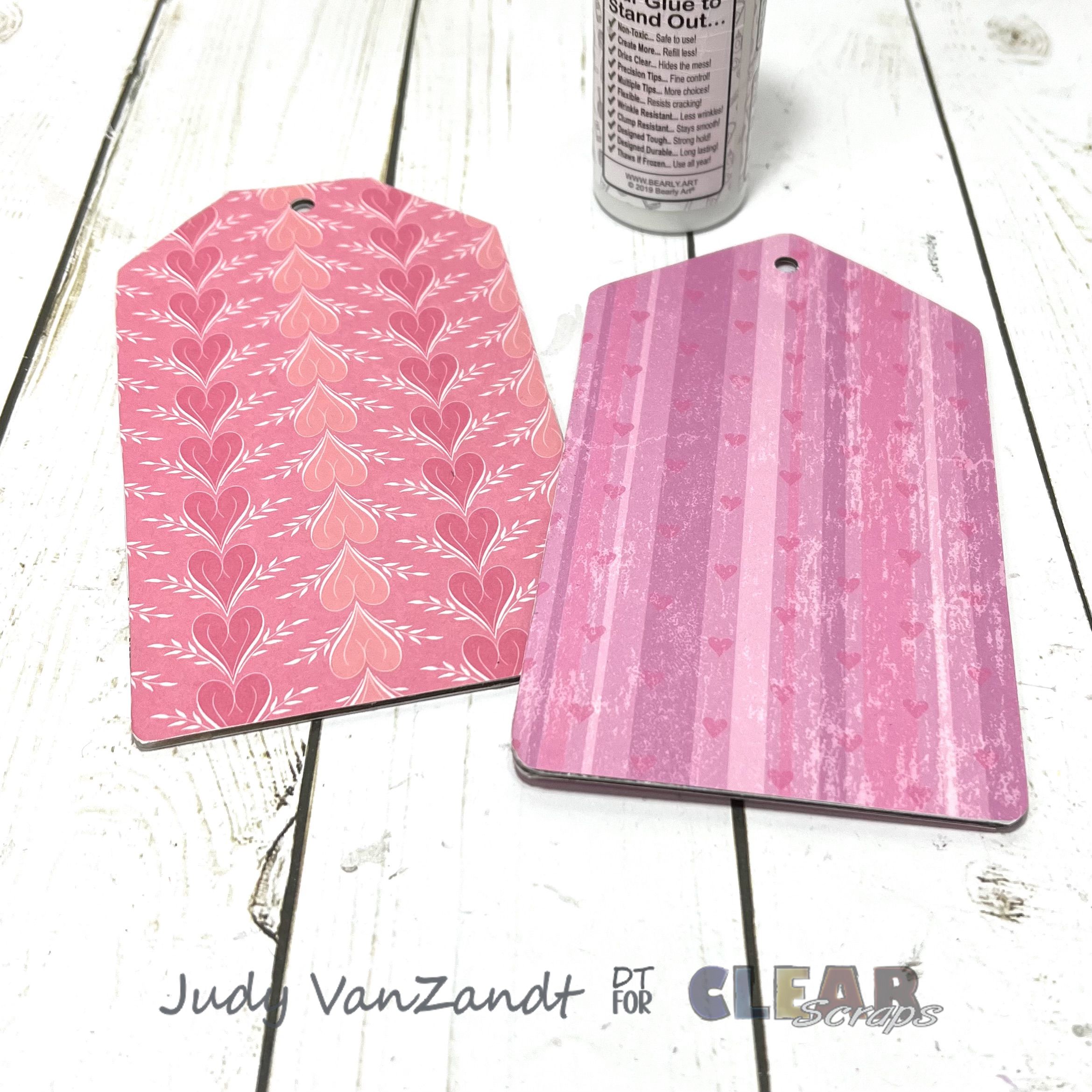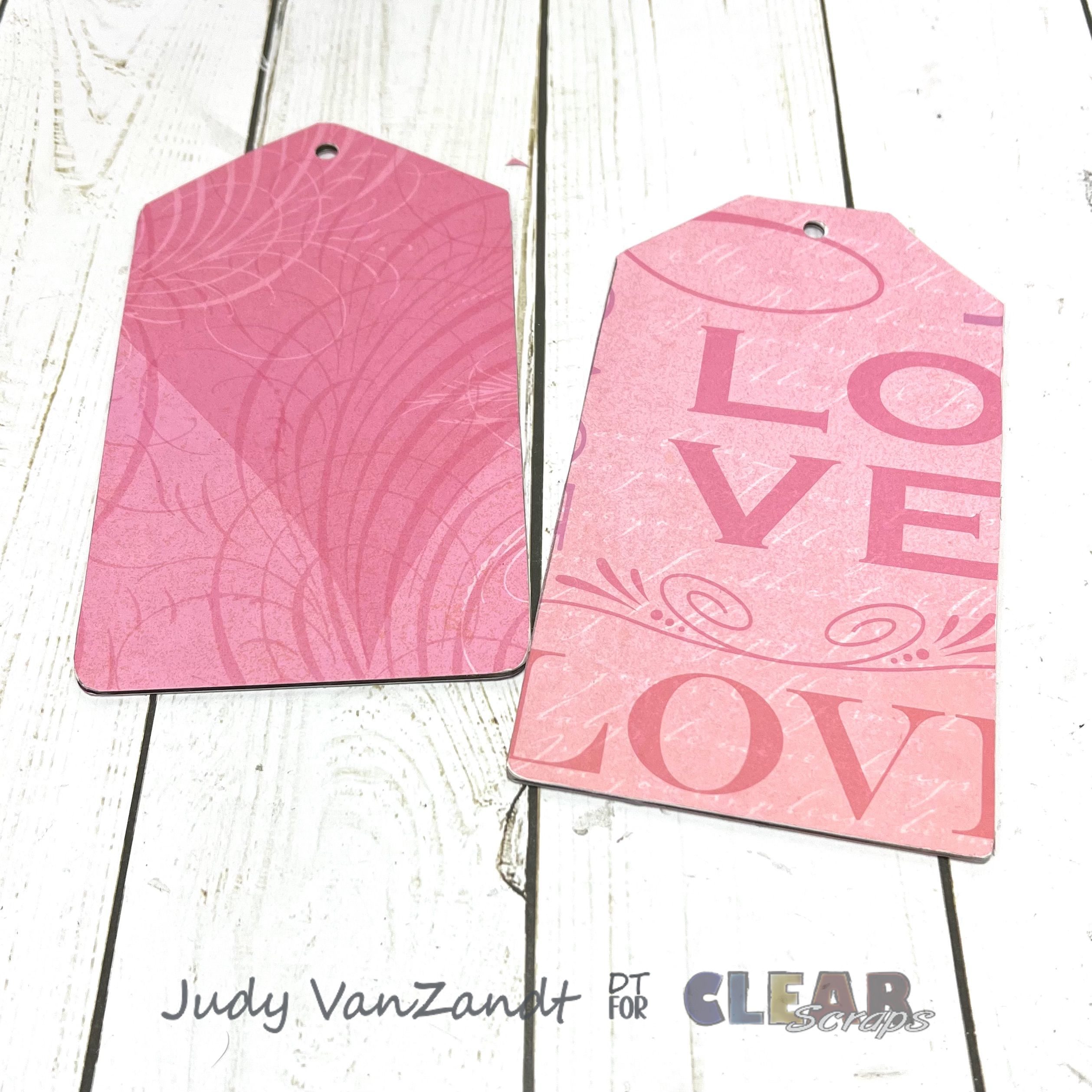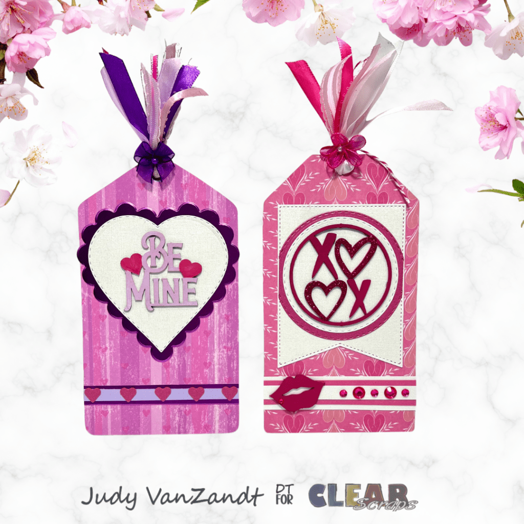 Tags are one of my favorite projects to create because they’re quick, versatile, and a great way to use up patterned paper and embellishments. Hey there, Judy here with with a couple of Valentine themed tags created for my latest project for Clear Scraps.