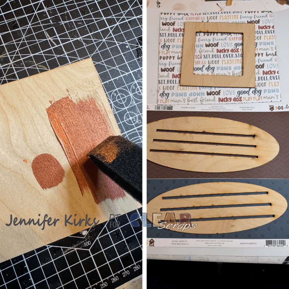 I began by painting the wooden frame and base with an orange copper paint. Next, I used some adorable dog-themed paper to cover the front of the frame and the top of the base. After tracing, cutting, and gluing the paper in place, I cleaned up the edges with an X-Acto knife. I also used the knife to cut the slits in the center of the base. Then, I inked the edges of both the frame and base with brown ink to add depth and dimension.
