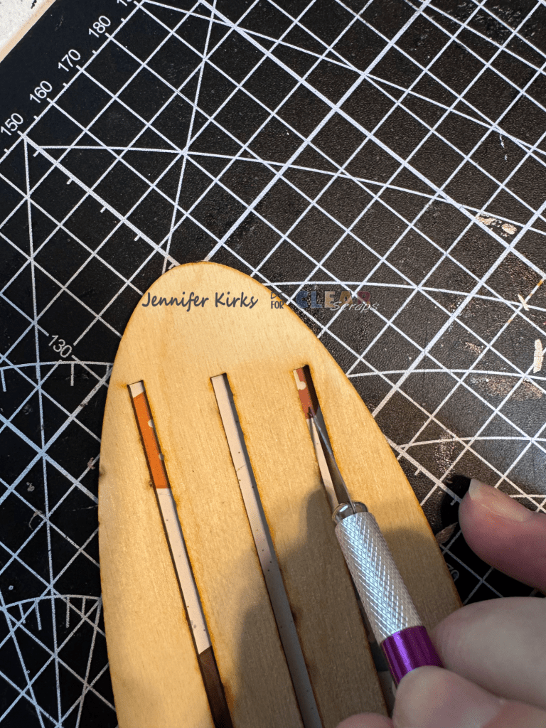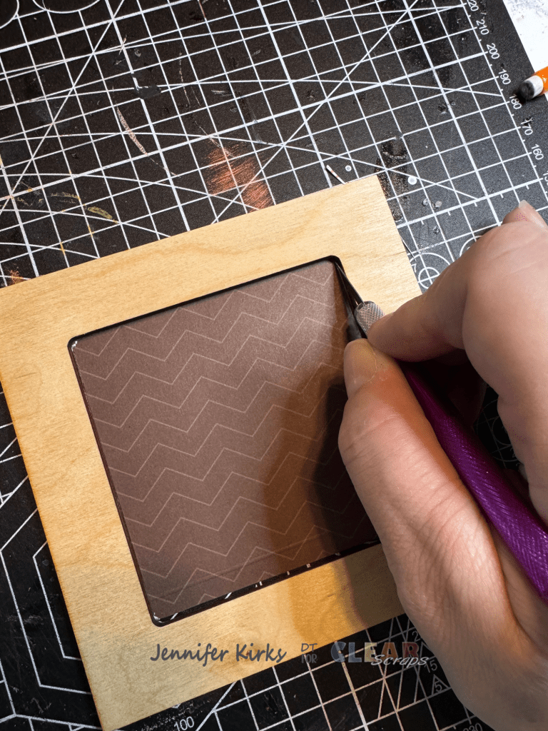 Using the X-Acto knife again, I carefully cut out the center of the frame. I placed foam dots around the outer edge of the larger frame so that when the top frame was added, a photo could still slide in between the two layers. I didn’t add any foam dots along the bottom, since that portion fits into the slits in the base.
