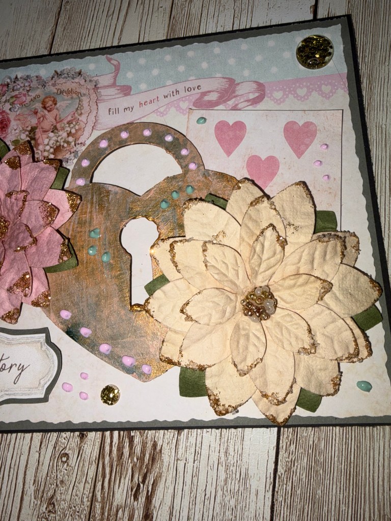 The Heart_Lock I went for a solid background and layered the printed cardstock and added my embellishments.