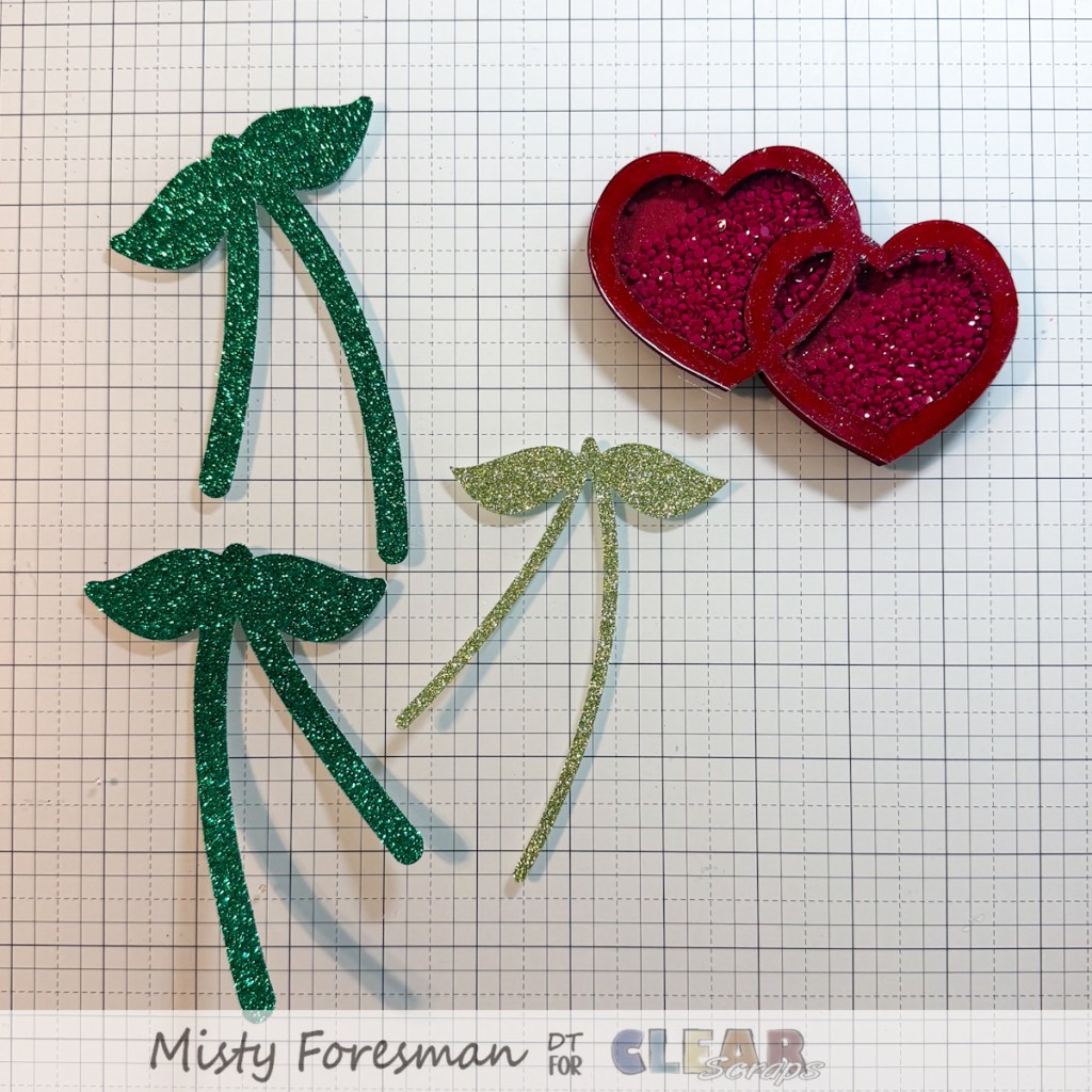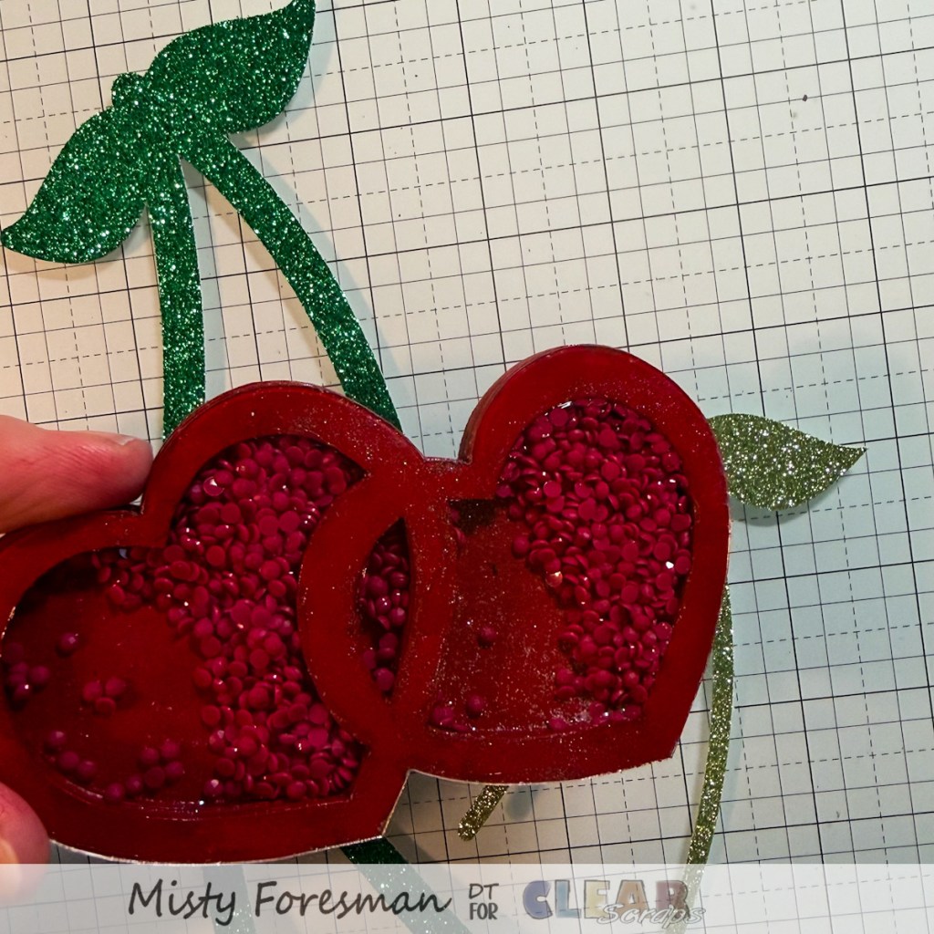 You guessed it! I turned those double hearts into cherries! With a deep red paint and some red diamond dotz, I set to work. I painted the entire shaker inside and out with that red paint. When it was dry, I added the diamond dotz to be the shaker filler. Why DIamond Dotz? Well…because they shimmer and shine and are the perfect size for a shaker! I used my Cricut Maker to cut out some stems from green glitter paper and put it all together.