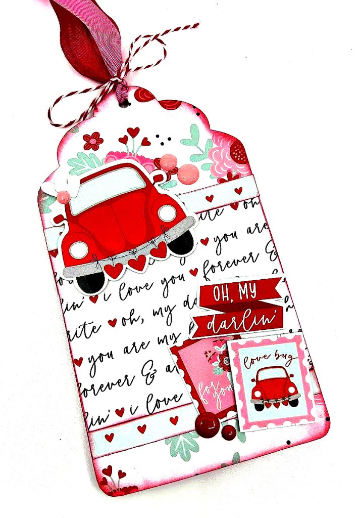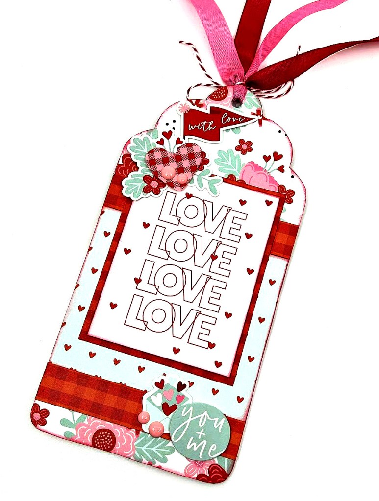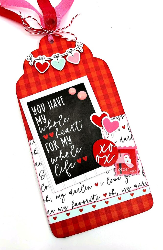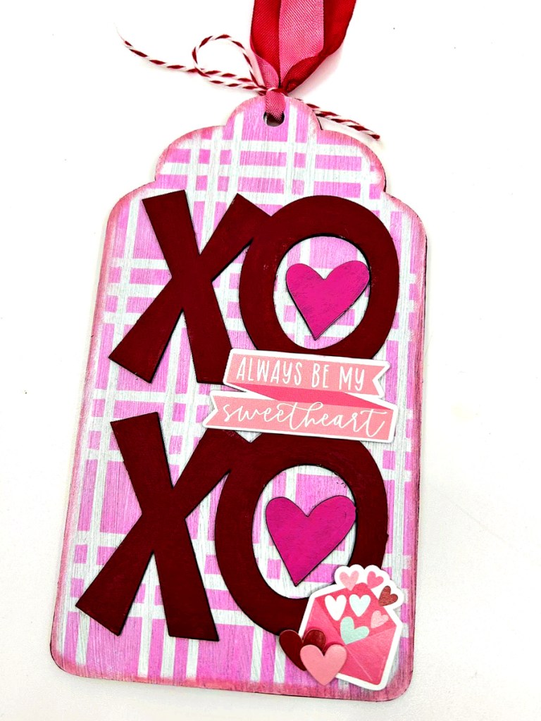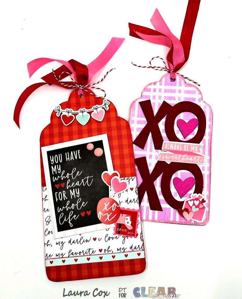 Distress ink was applied with a soft blending brush to create the plaid design. Then the “XO”s were created using the Clear Scraps XOXO Chipboard Embellishments. They are painted with red and pink acrylic paint, then glued onto the tag once dry. A few stickers finished this tag off perfectly! You could leave the back plain, but I love to decorate BOTH sides!