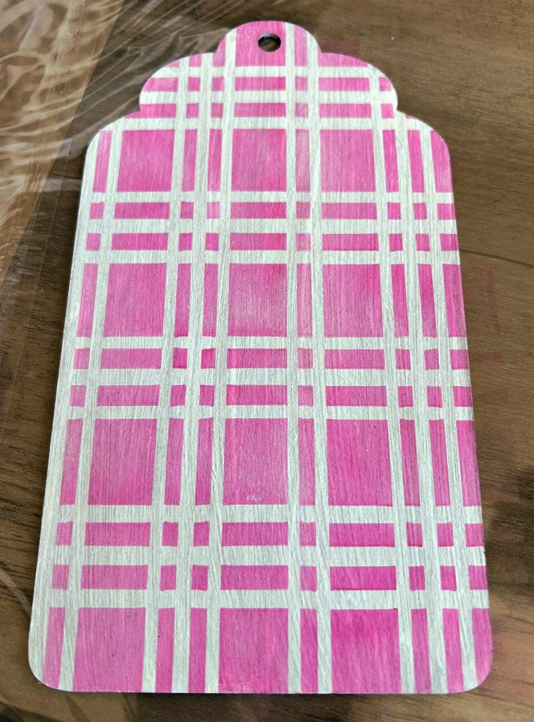 To create this smaller tag, it was painted with white acrylic paint, then I used the Clear Scraps 5×9 Plaids Mixer Stencil.