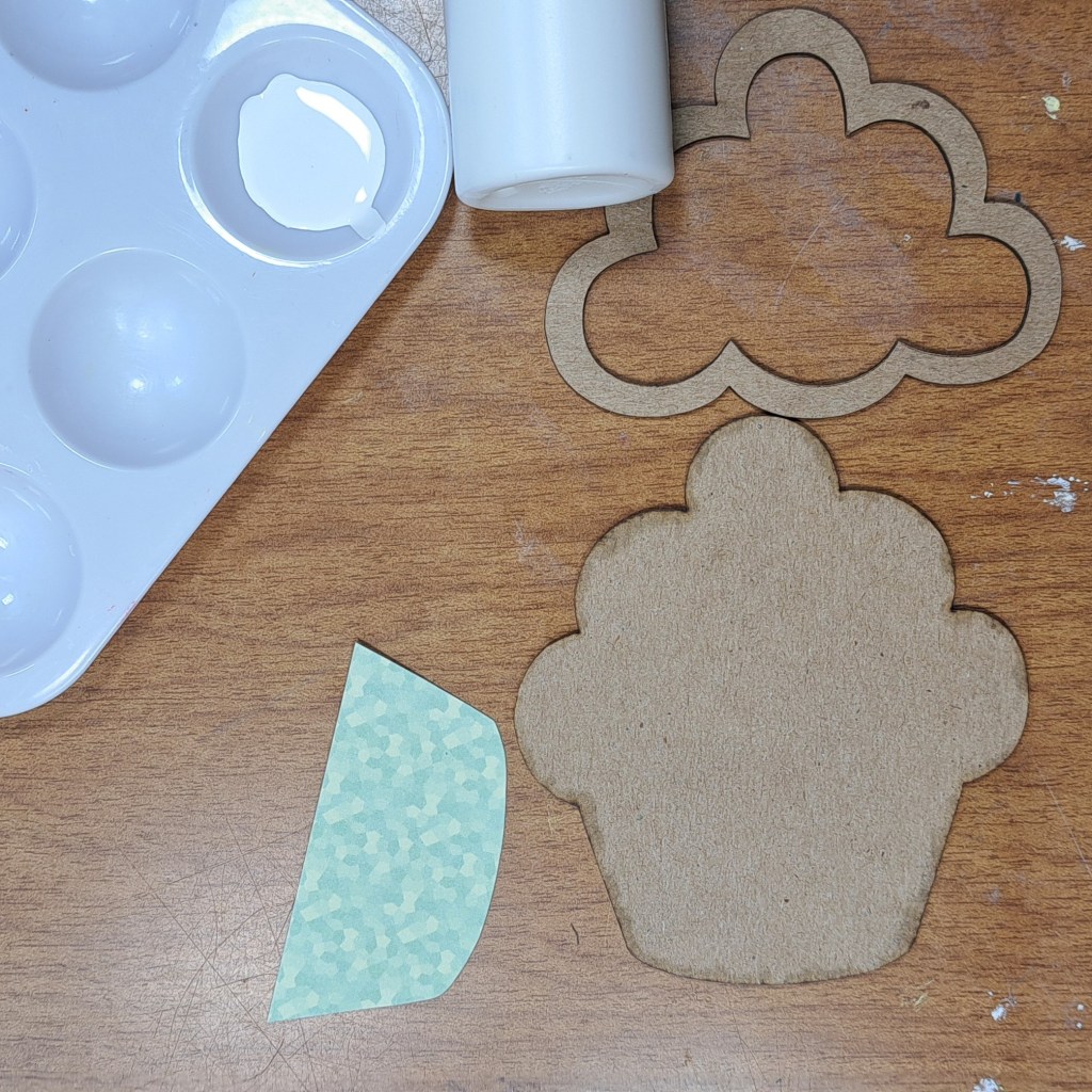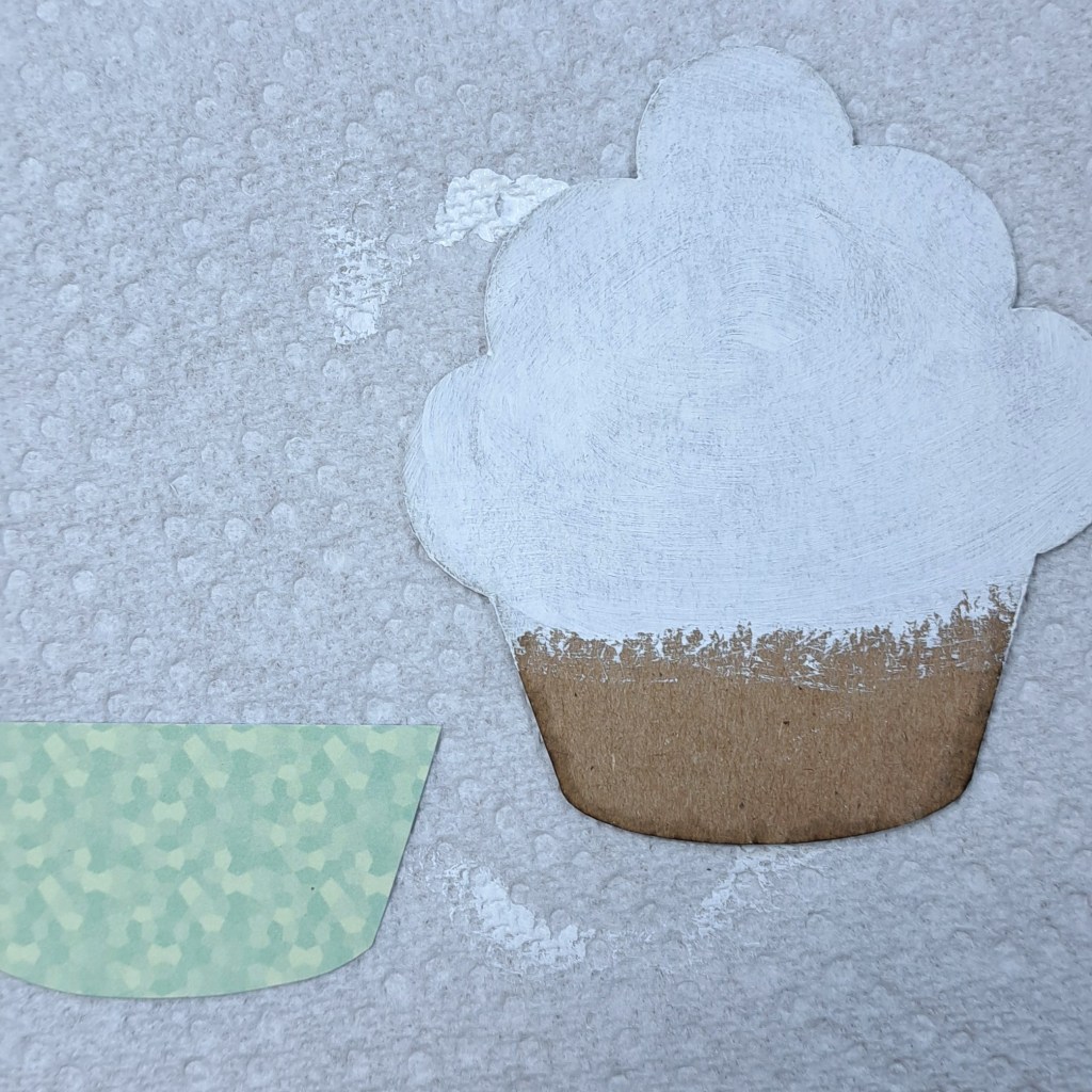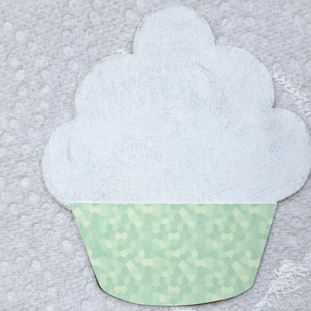 I started by tracing the bottom of the Mini Cupcake Chipboard Shaker onto the pattern paper. I trimmed it out. Next, I paint the front frame and the background of the Mini Cupcake Chipboard Shaker with white paint.