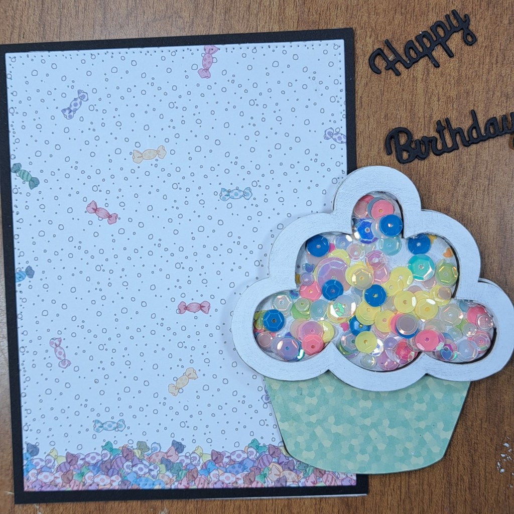 Now, that all my componets are dry I can assemble my card. I adhere the black cardstock to the cardbase. Followed by the pattern paper. I then center and adhere the Mini Cupcake Chipboard Shaker onto the card front. I adhere the word happy birthday above the Mini Cupcake Chipboard Shaker. I finish the card with a few sequins.