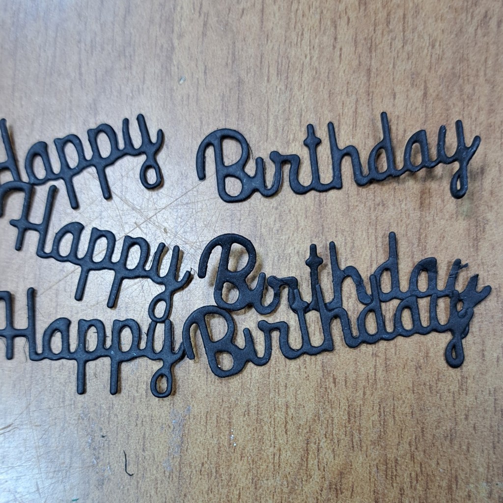 I die cut the words Happy Birthday three time and adhere them together. I set them aside to dry.