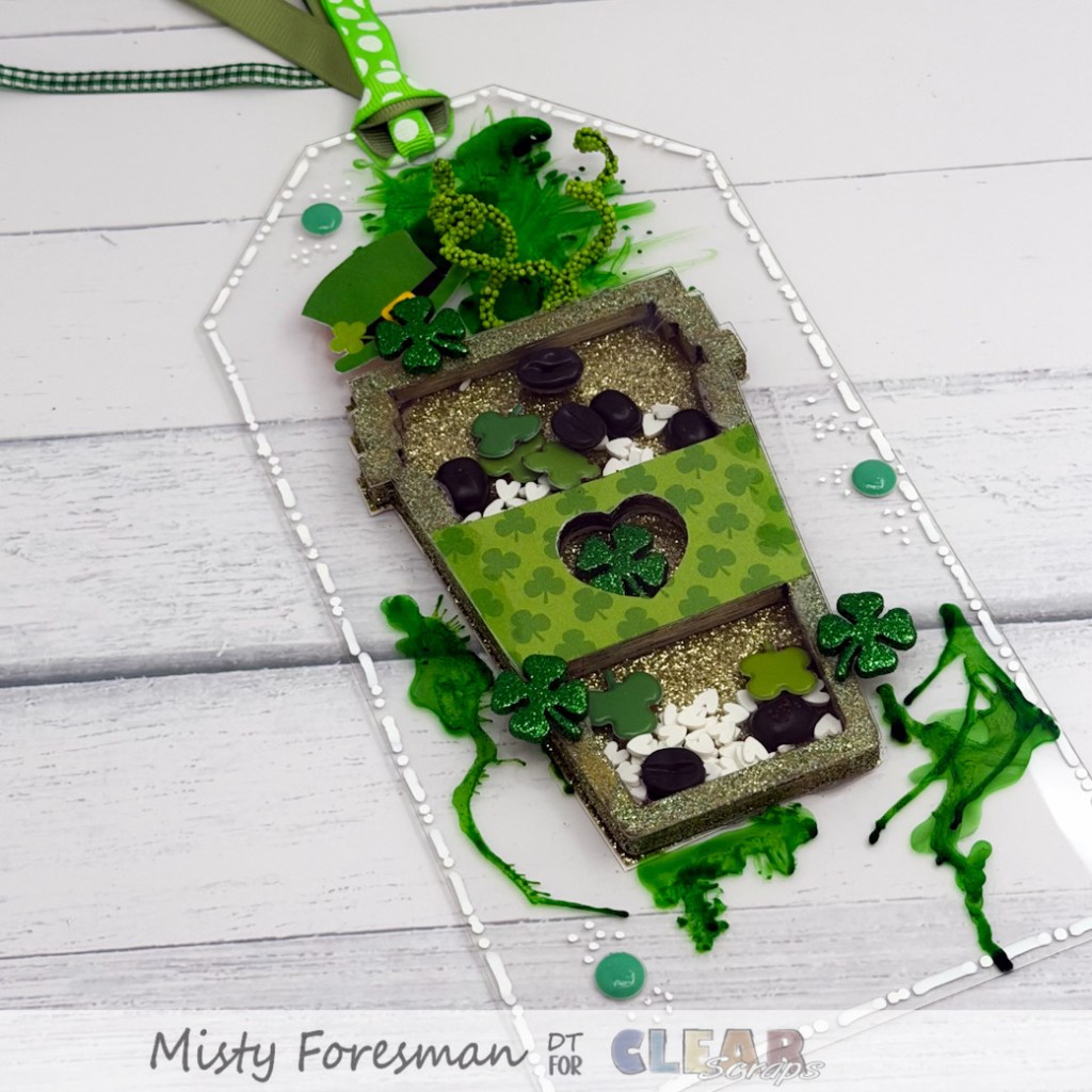 That brings me to my project for today! You all know my love for the clear acrylic tags is more of an obsession, right? Well, it is. As is my daughter’s love for coffee. I decided to create a Clear Tag and ad the Coffee Cup Shaker to it…and give it an Irish spin! I used the #10 Acrylic Angle tag for this and it was perfect!
