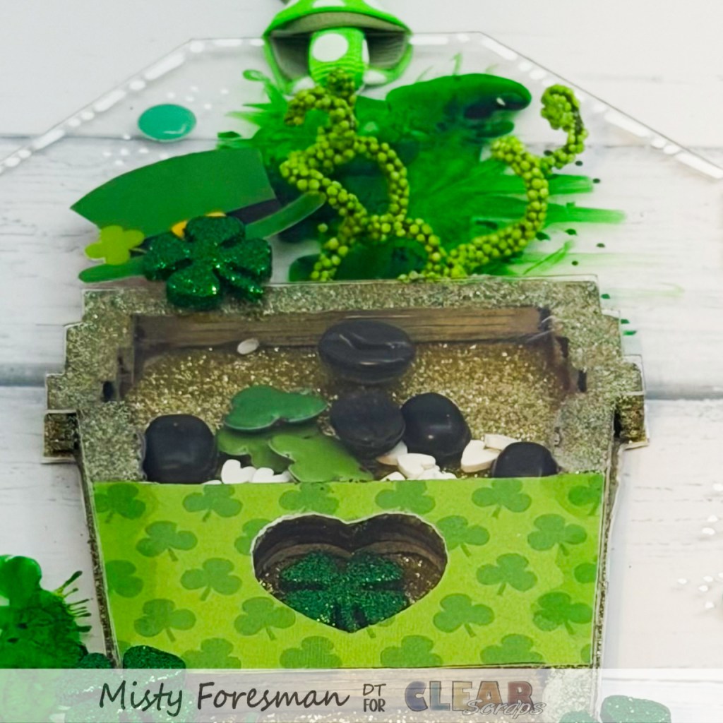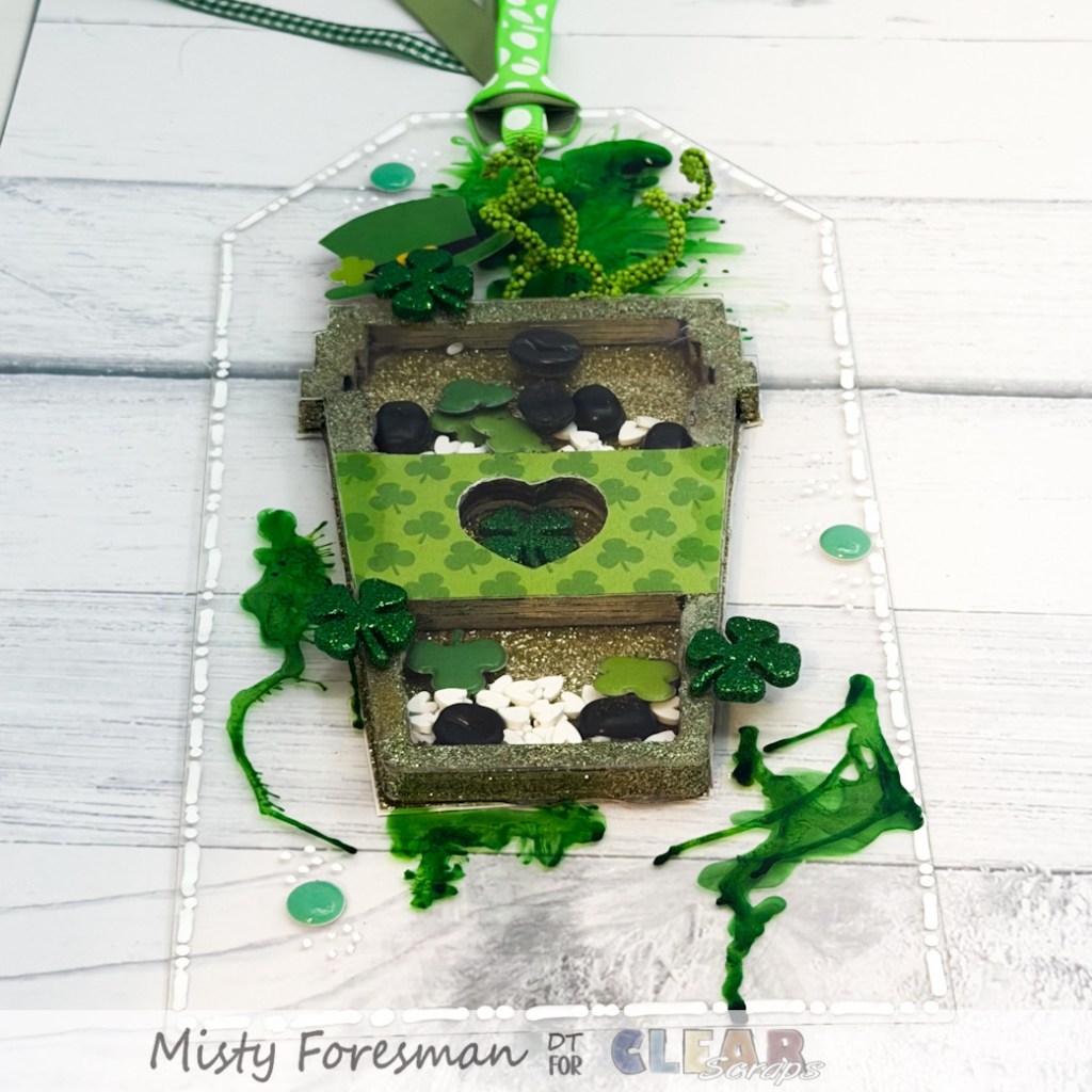 After assembling the coffee mug, I simply painted it with gold paint and sprinkled glitter on it before it dried. I used Gold Glitter Cardstock for the backing, and puffy shamrock stickers to keep the” “Lucky” Irish vibe . I tossed in some coffee bean filler before sealing it up. All the green is nothing more than green alcohol ink that I splatted onto the tag. Once it dried, I added the shaker and used a white acrylic marker for the edges. I added a few more green embellishments to enhance the “Irish Coffee” concept and it was done!
