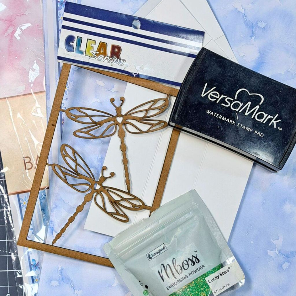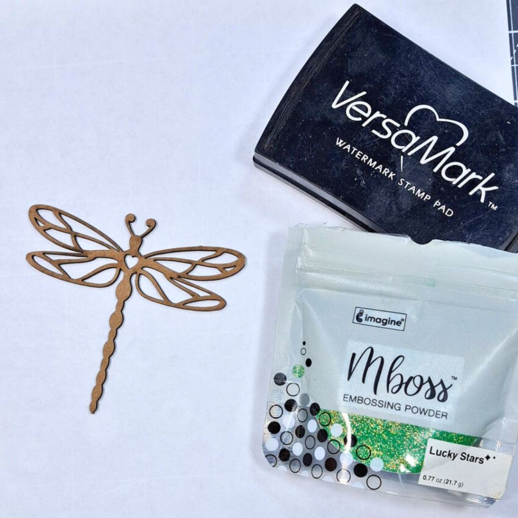 I gathered theClear Scraps: Dragonflies Chipboard Embellishments and trimmed out one Dragonfly. I got the VersaMark ink, the embossing powder and my heat tool.
