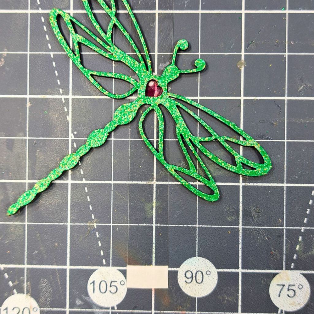 I then trimmed a piece of acetate to about 1/2″ x 4 ” strip. I then placed the dragonfly onto the acetate and marked with a red alcohol marker through the heart. Removed the dragonfly and made the dot a bit bigger.