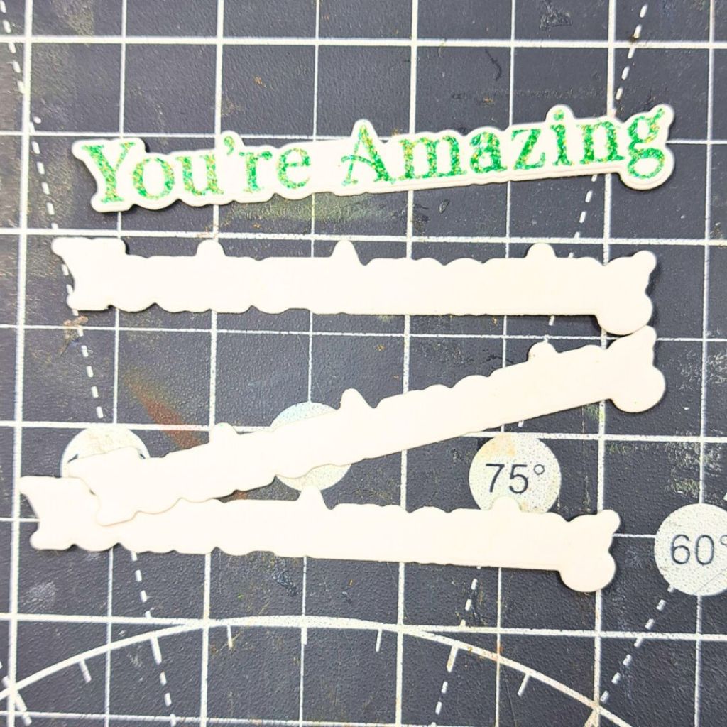 Next, I stamp and embossed the sentiment using the same embossing powder that I used for the Clear Scraps: Dragonflies Chipboard Embellishments. I die cut the sentiment and a few more blank piece and adhered them together to create a firm piece.