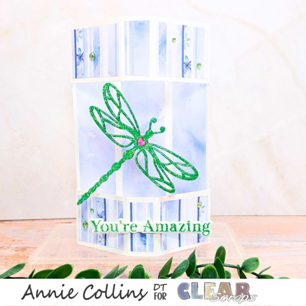 Hello Crafty Friends – Annie here with a floating hexagon card featuring the Dragonflies Chipboard Embellishments from Clear Scraps.