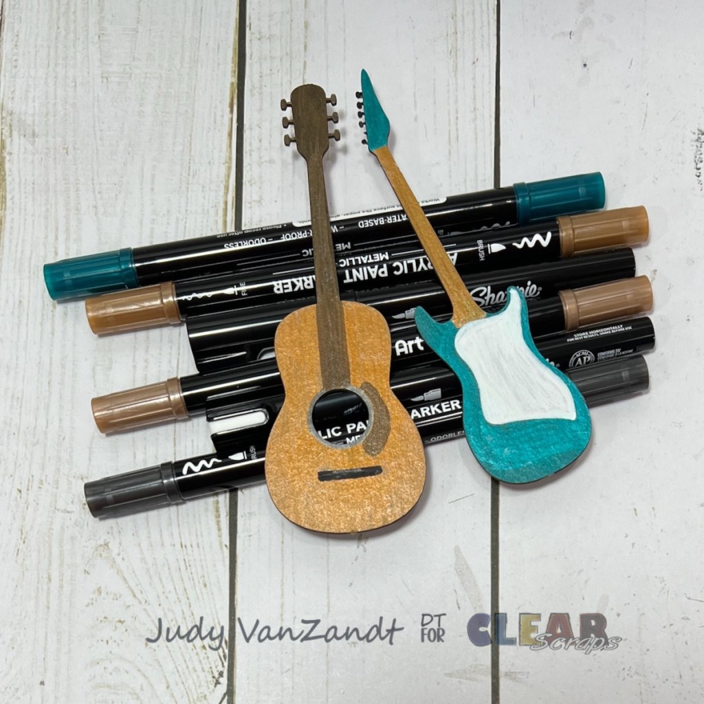 Paint or ink the Clear Scraps chipboard guitars to coordinate with your backgrounds. I used metallic acrylic markers.