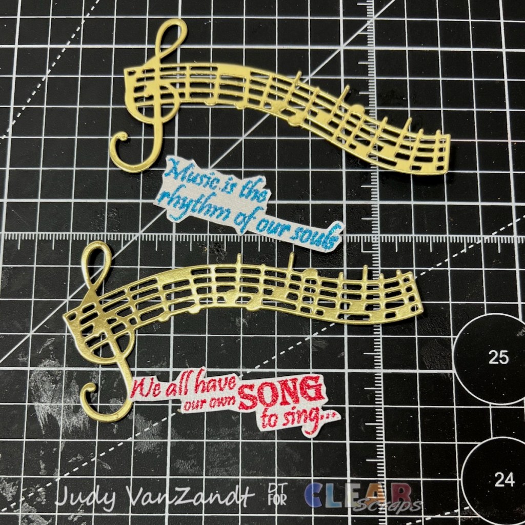 Music-themed sentiments are stamped, heat embossed and fussy cut.