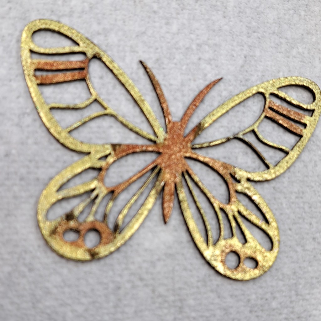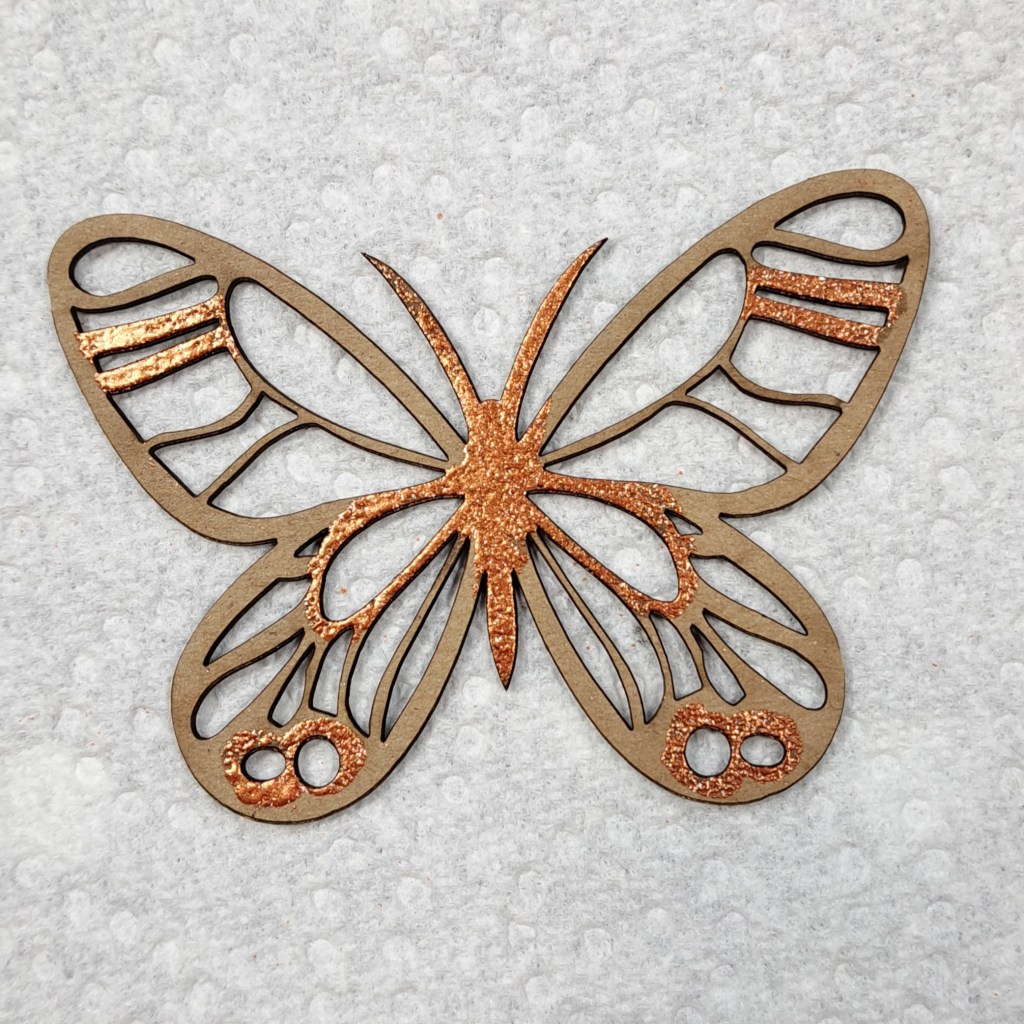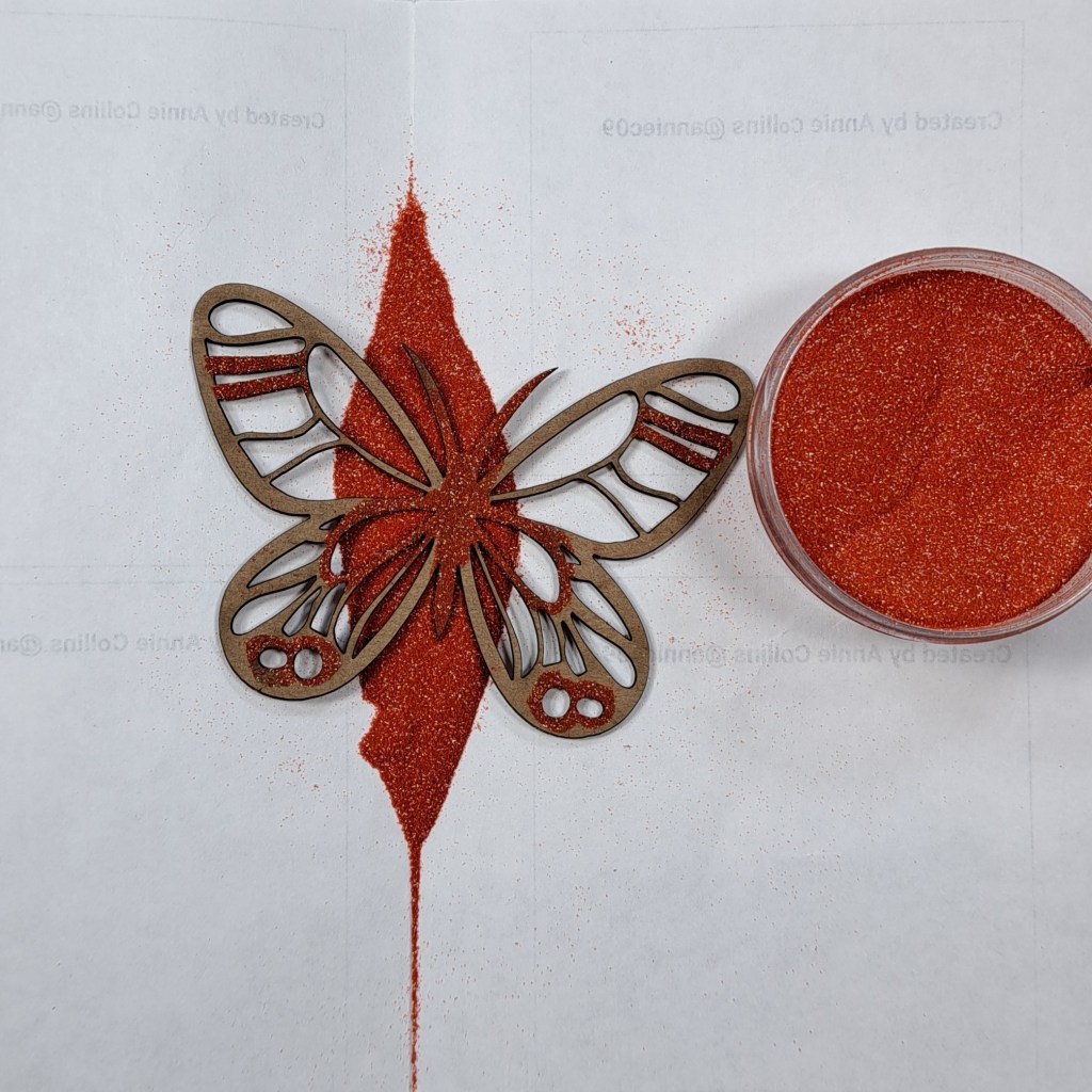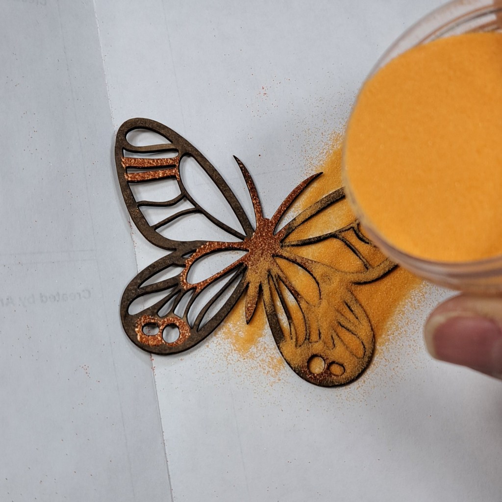 I repeated the process but this time I used the Cantaloupe and Buttercup Petal embossing powders. Heat set all the powders and set the butterfly a side.