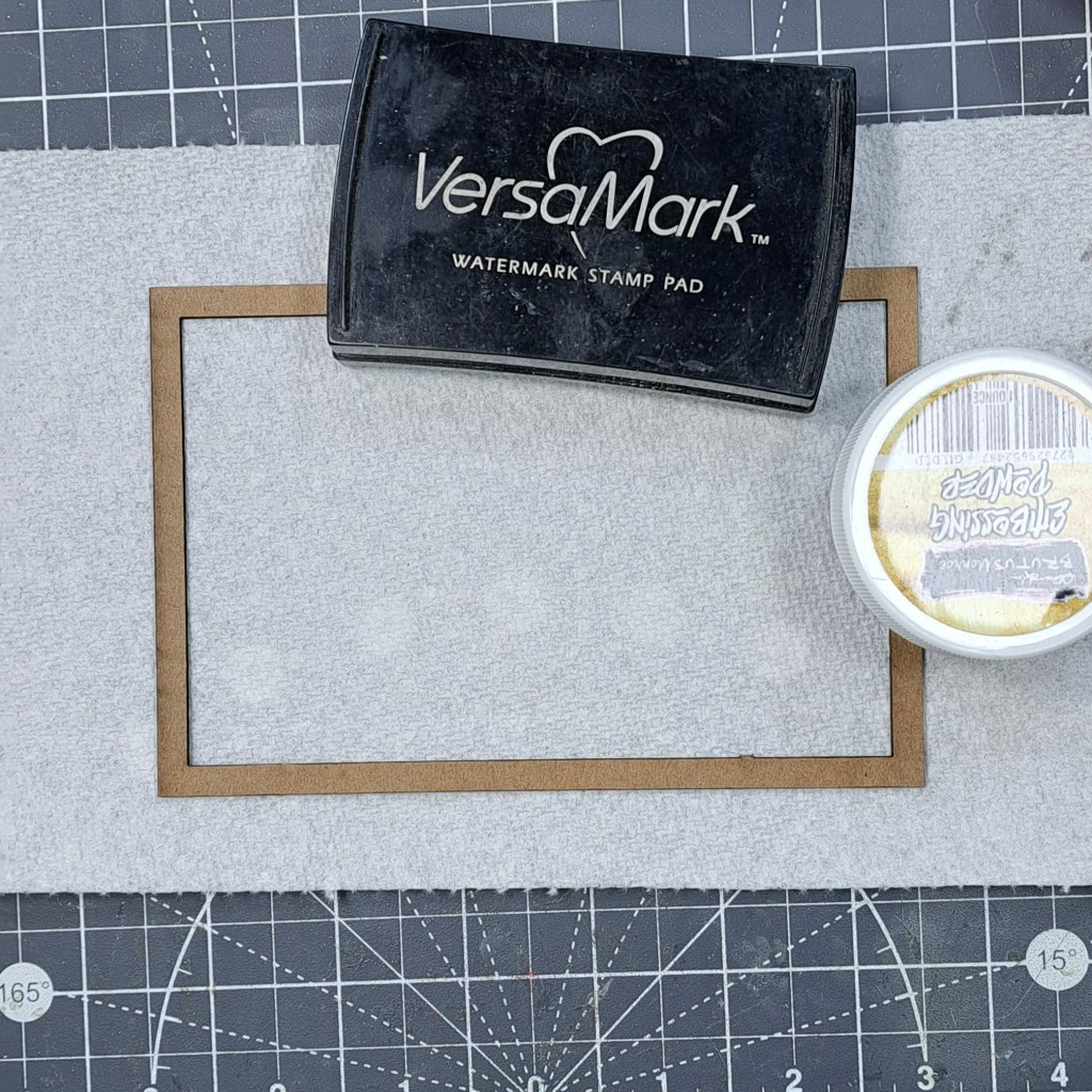 Step. 3: I used VersaMark Ink on the frame that the Fancy Butterflies Chipboard Embellishments come on. I cover with Gold embossing powder and heat set it.