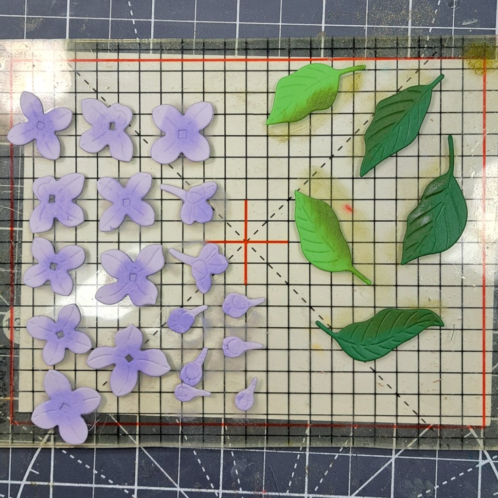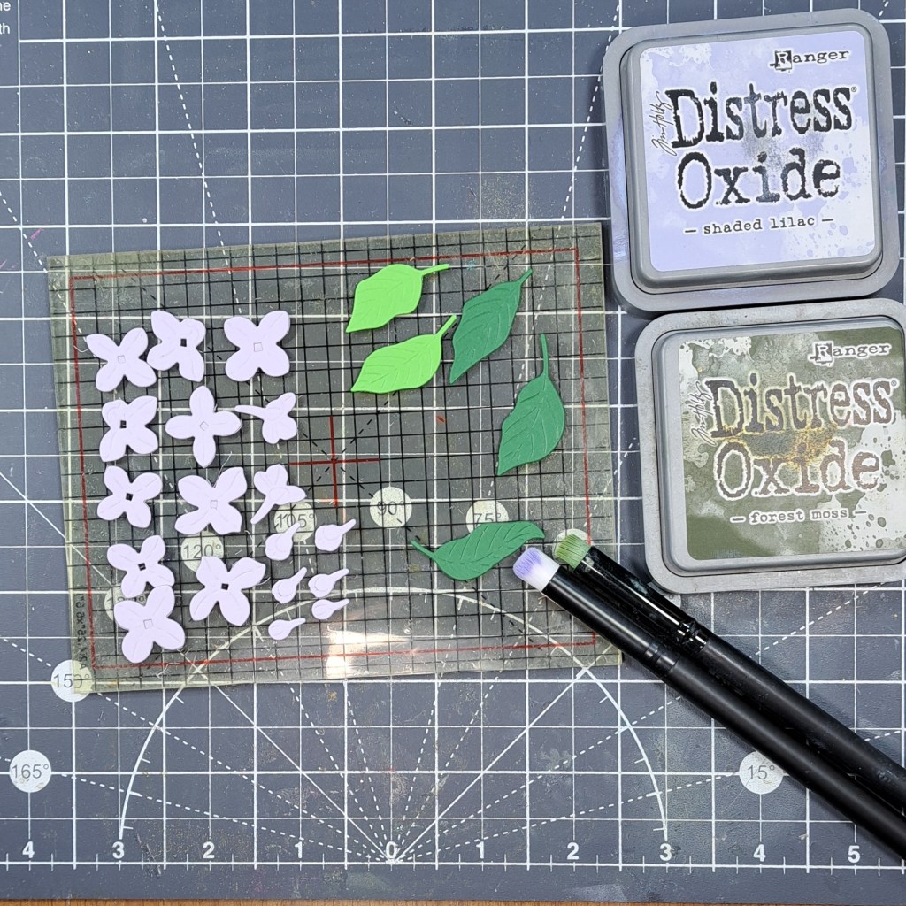 Step. 4: I die cut several lilac flowers and leaves from Lilac cardstock and two shaded of Green cardstock. I place them onto an photopolymer mat. I then use some Distress Oxide ink in Shaded Lilac for the center of the flowers and a bit of Forest Moss on the leaves for a bit of dimension.