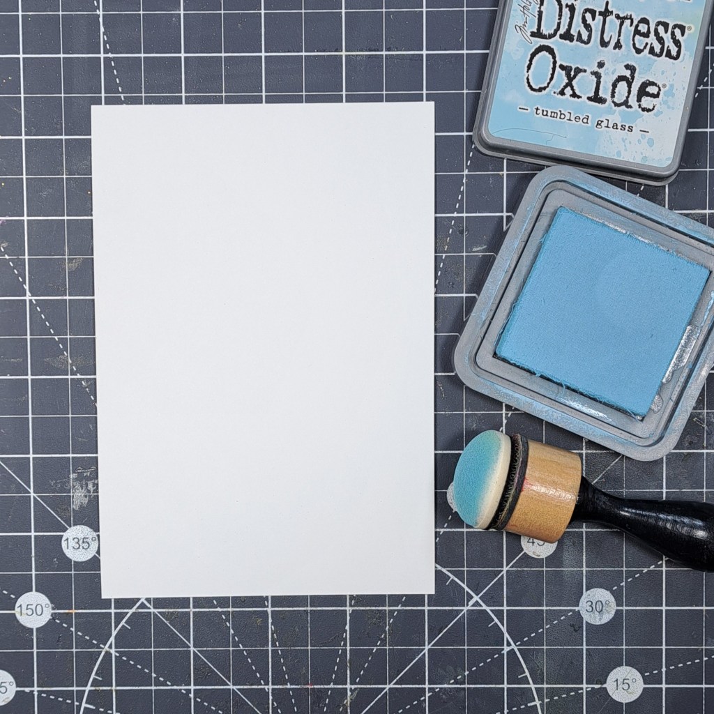 Step. 1: I start my trimming down a panel of white cardstock.to 4-1/4″ X 6-1/4″. I then apply some Distress ink in Tumbled Glass onto the panel.