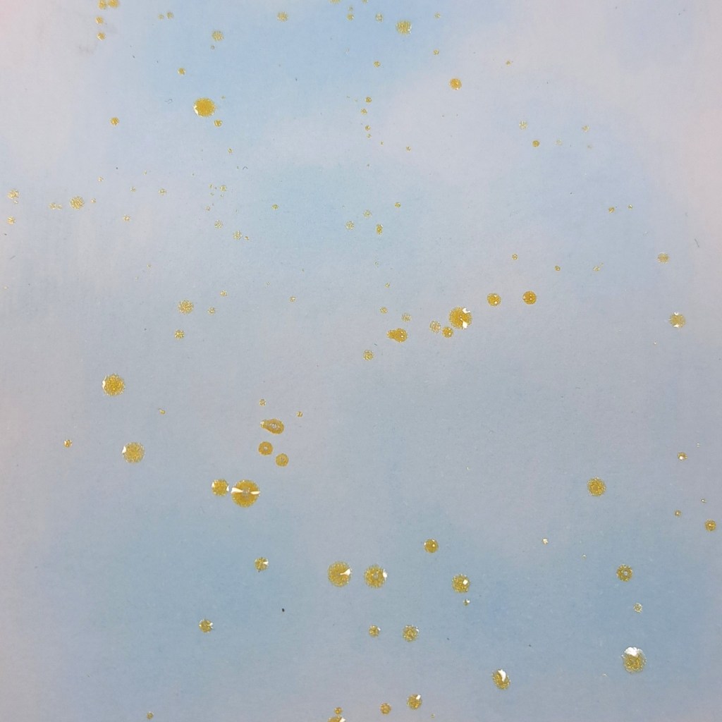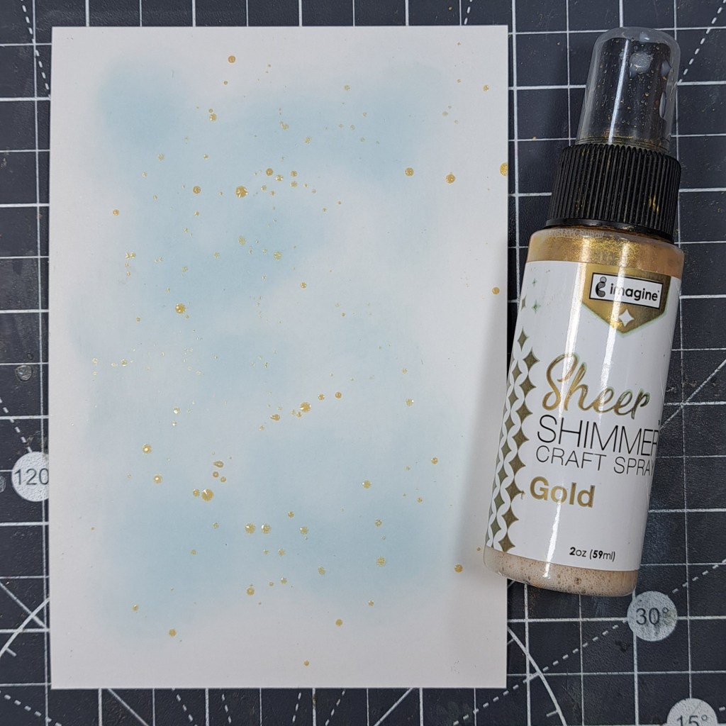 Next, I splatter some Imagine Crafts Sheer Shimmer Craft Spray in gold onto the panel.