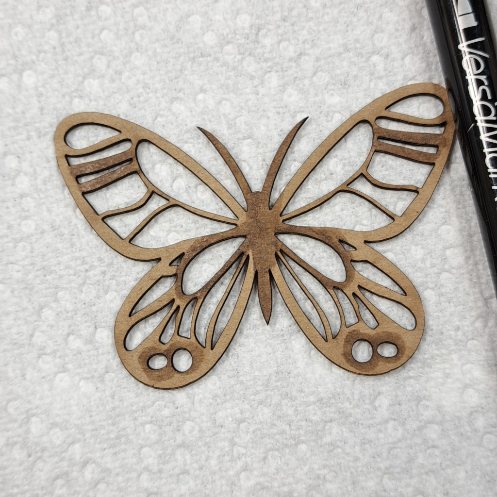 Step. 2: I trimmed the Fancy Butterflies Chipboard Embellishments from the frame it comes on. I save it for later. Next, I apply some VersaMark ink onto the Fancy Butterflies Chipboard Embellishments. I used the marker instead of the pad for my butter because I wanted two colors on the butterfly and this would give me better control.