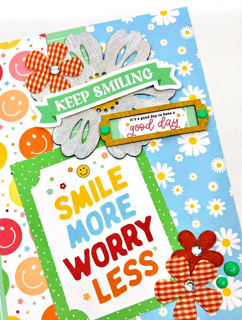 The cute flower in the upper right corner of this LO is from the Clear Scraps Spring Chipboard Embellishments set. Most of the Chipboard Embellishments come as a set so you have more than one piece to use. You can use them on the same project or split them up for other projects. I wanted the flower to look daisy like, so I painted it with white and yellow acrylic paint. The little saying on the daisy is framed in a bracket from the Clear Scraps Vintage Frames Chipboard Embellishments. This set of 4 brackets/frames is great to use to highlight any word or saying on a scrapbook page, a card, home decor, or any project really!